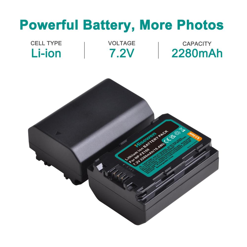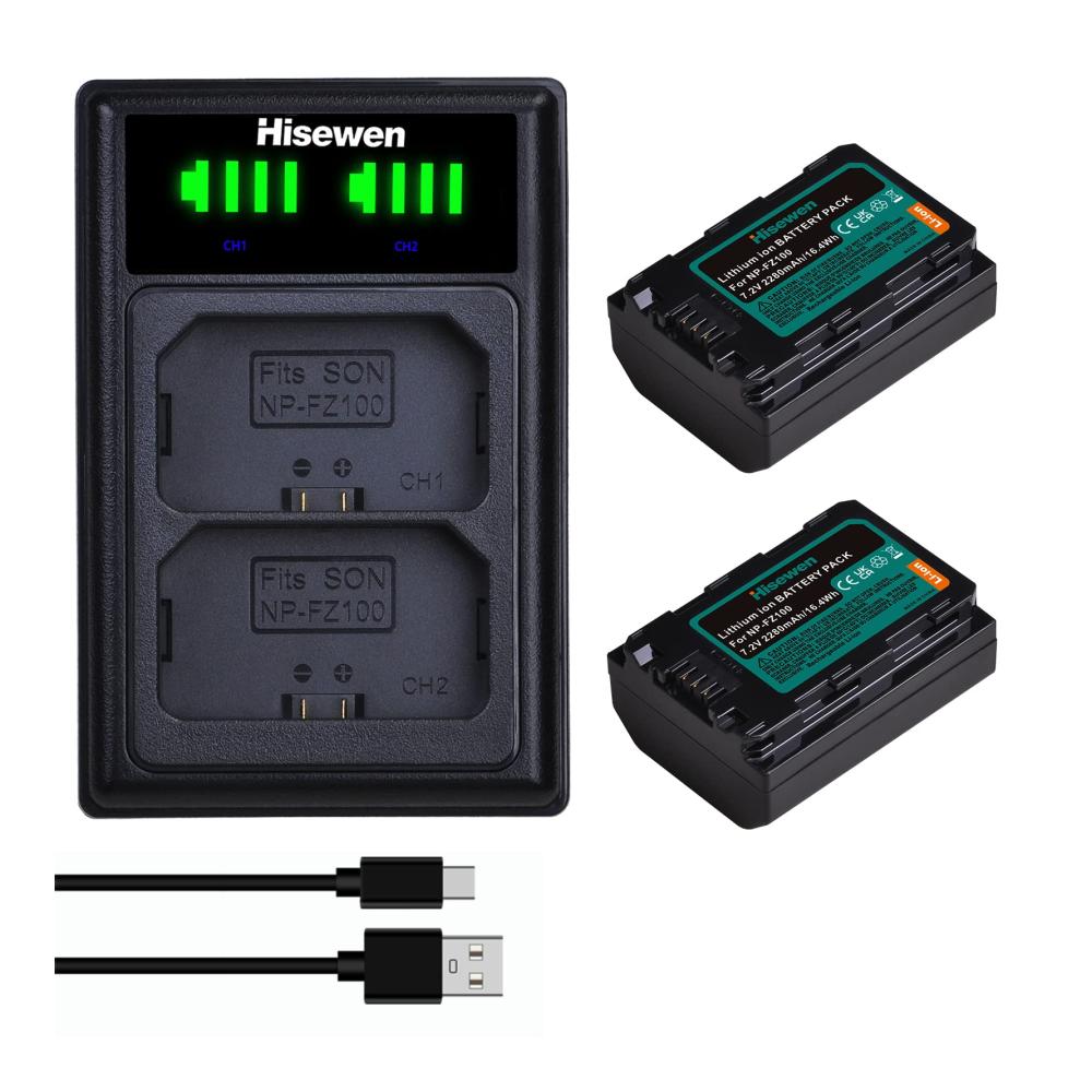 Das NP-FZ100 Akku 2 Pack 2280mAh Dual USB Ladegerät von Hisewen ist die perfekte Ergänzung für Sony Kameras, darunter die Alpha A7III, A7RIII und viele mehr. Mit einer Spannung von 7.2V und einer Kapazität von 2280mAh bietet es eine zuverlässige Stromversorgung für Ihre Foto- und Videoaufnahmen.