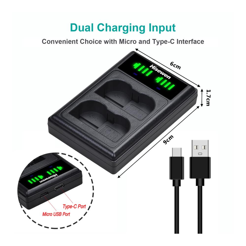 【Schnelles Ladegerät】Doppeltes Batterieladegerät kann zwei Batterien gleichzeitig und unabhängig voneinander aufladen. Auch nimmt mit Typ-C und Micro-USB-Ladeanschluss, können Sie es über Wand-Ladegerät, Powerbank, Laptop, Auto-Ladegerät aufladen.