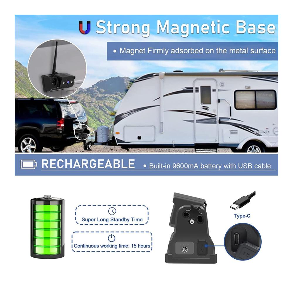 [ magnetische Basis] Die drahtlose Rückfahrkamera mit Magnetkupplung ist mit 6 (N45) starken Magneten ausgestattet, die einfach an jeder Metalloberfläche befestigt werden können; Es müssen keine Kabel angeschlossen oder andere Hardware gebohrt werden, wodurch Installationskosten gespart werden. Es hilft Ihnen, Ihr Fahrzeug einfach an Anhänger, Boote, Wohnmobile, Wohnmobile und Sattelkupplungen anzuschließen.