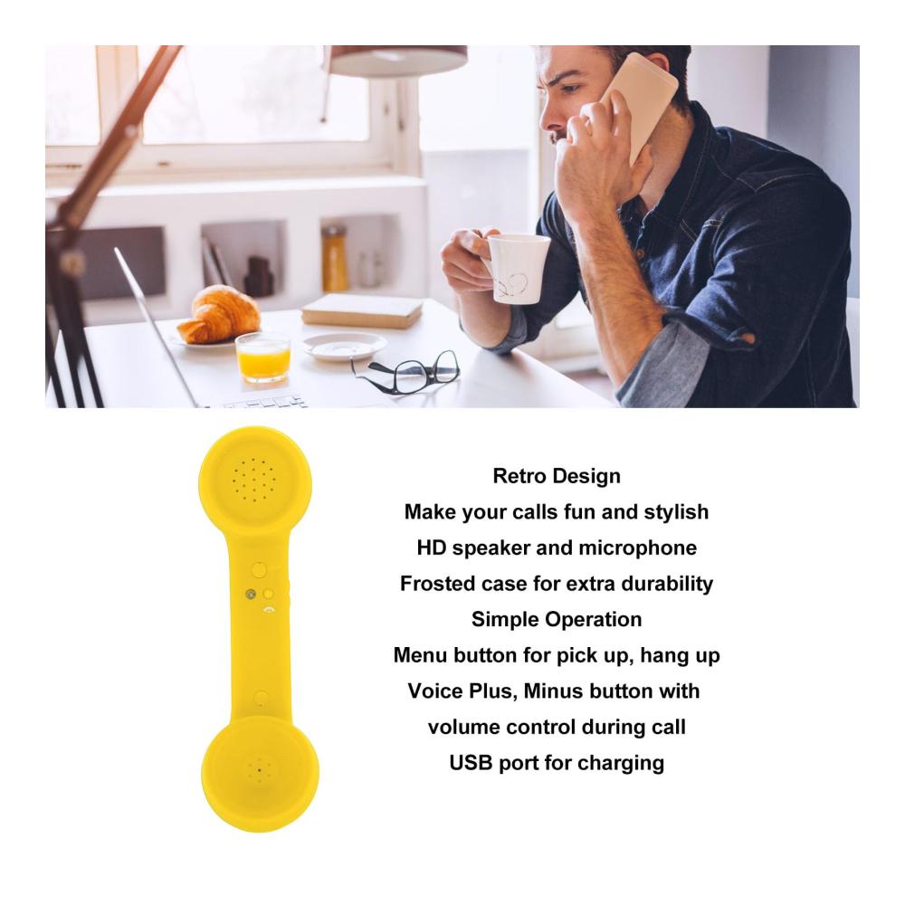 Unser gelber Retro-Bluetooth-Telefonhörer kombiniert Nostalgie mit moderner Technologie. Hergestellt aus ABS-Material mit einem eingebauten Lithium-Polymer-Akku für 8 Stunden Gesprächszeit und 72 Stunden Standby. Mit einer Reichweite von ca. 8–10 m ist er ideal für unterwegs. Das Paket enthält den Telefonhörer, eine Bedienungsanleitung und ein Ladekabel.