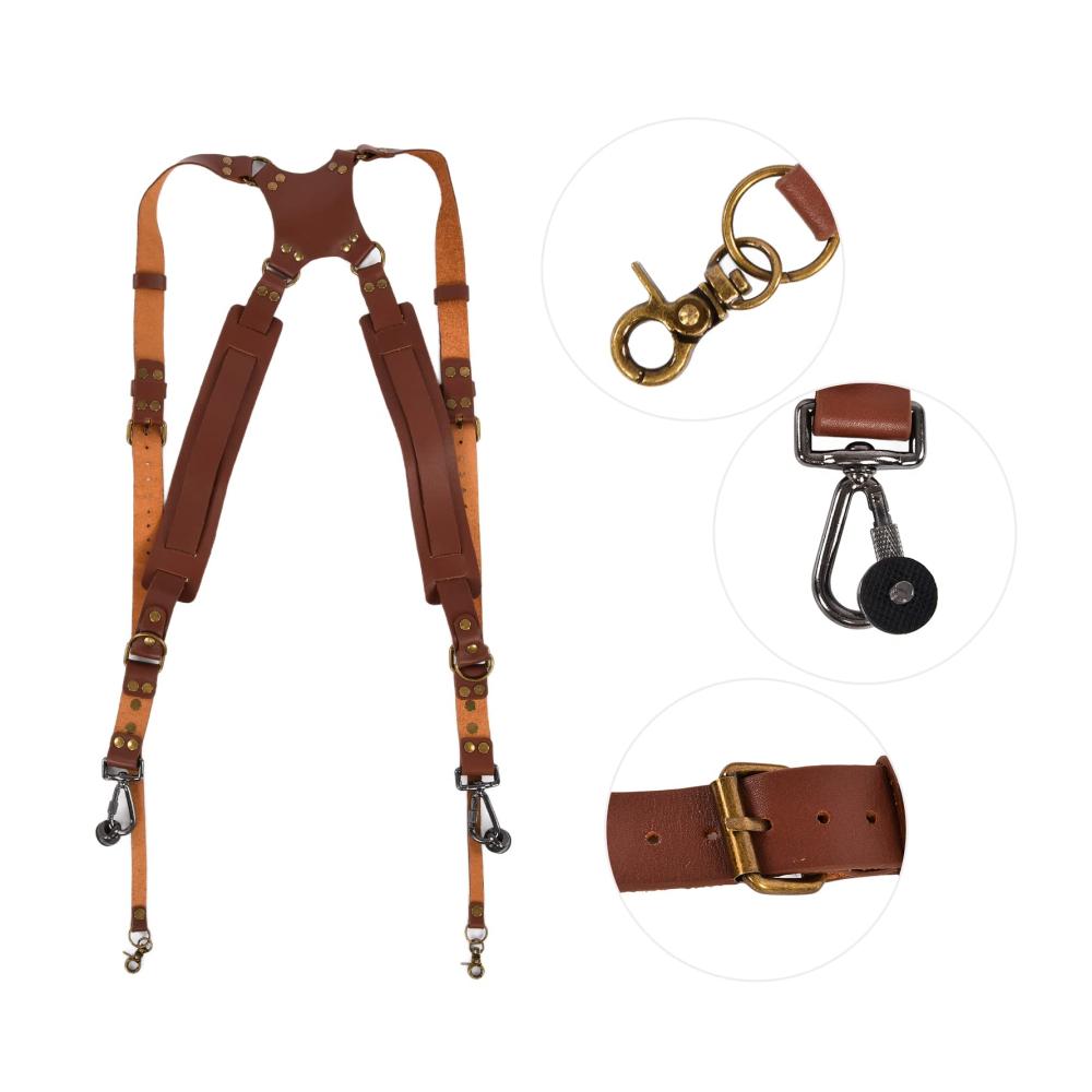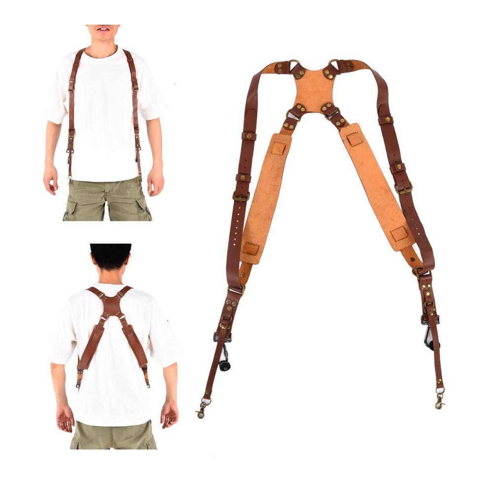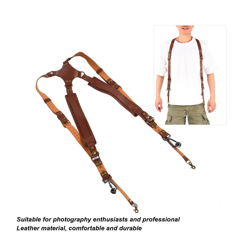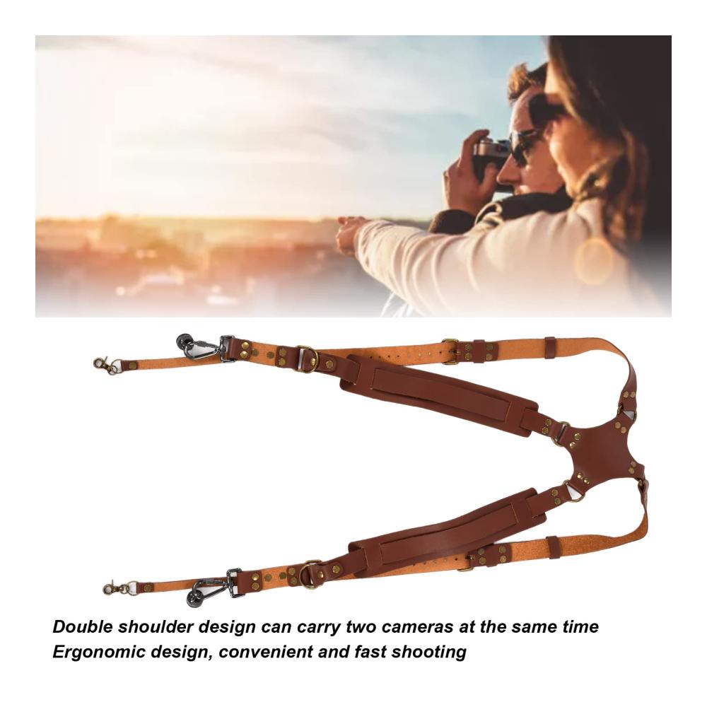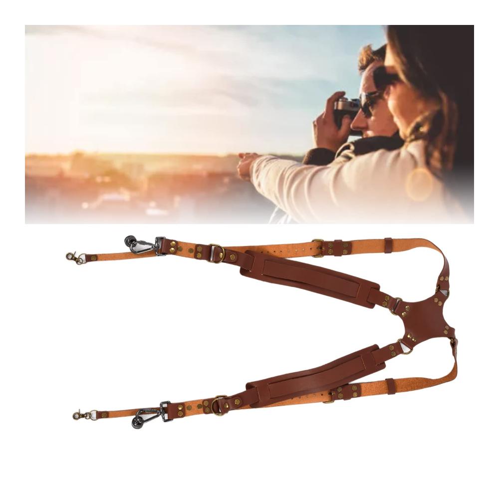 Doppelter Schultergurt: Mit diesem doppelten Schultergurt aus Leder können Sie bequem zwei Kameras gleichzeitig tragen und schnell darauf zugreifen, was ihn ideal für Fotografen macht, die mühelos zwischen den Kameras wechseln müssen.