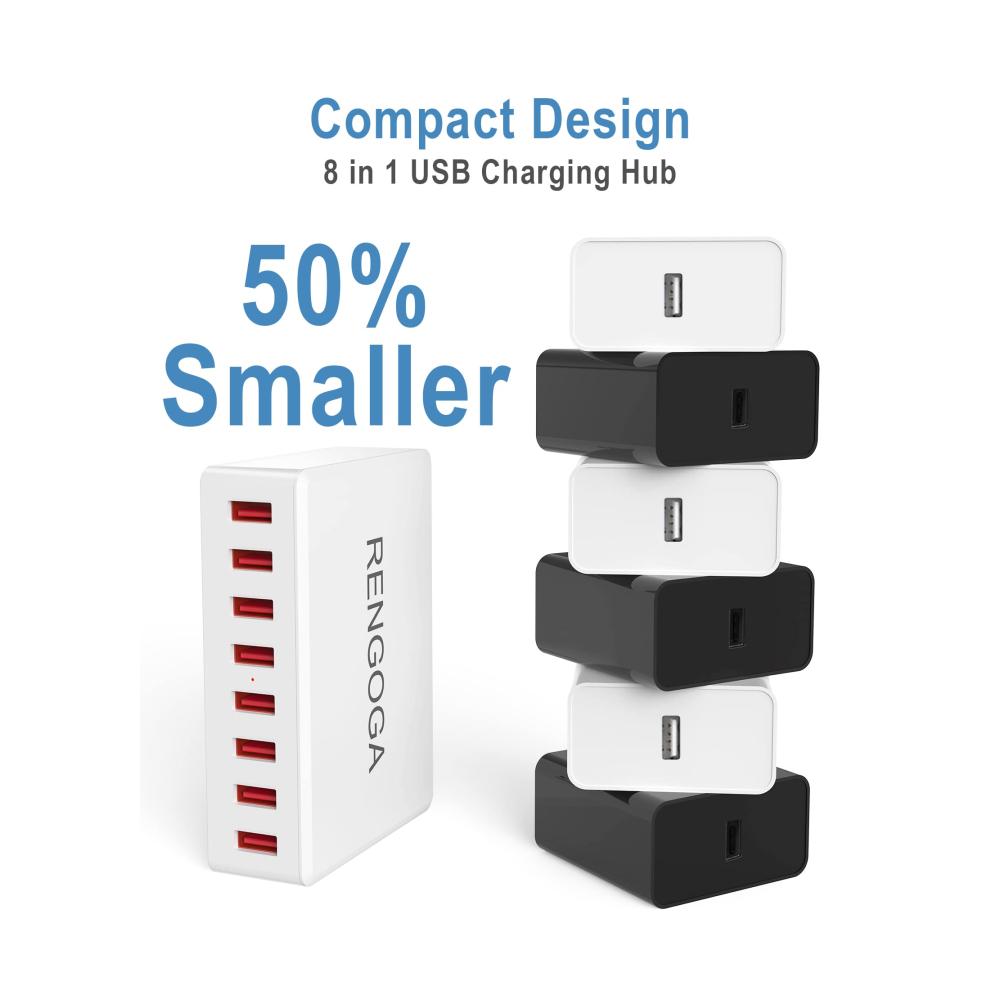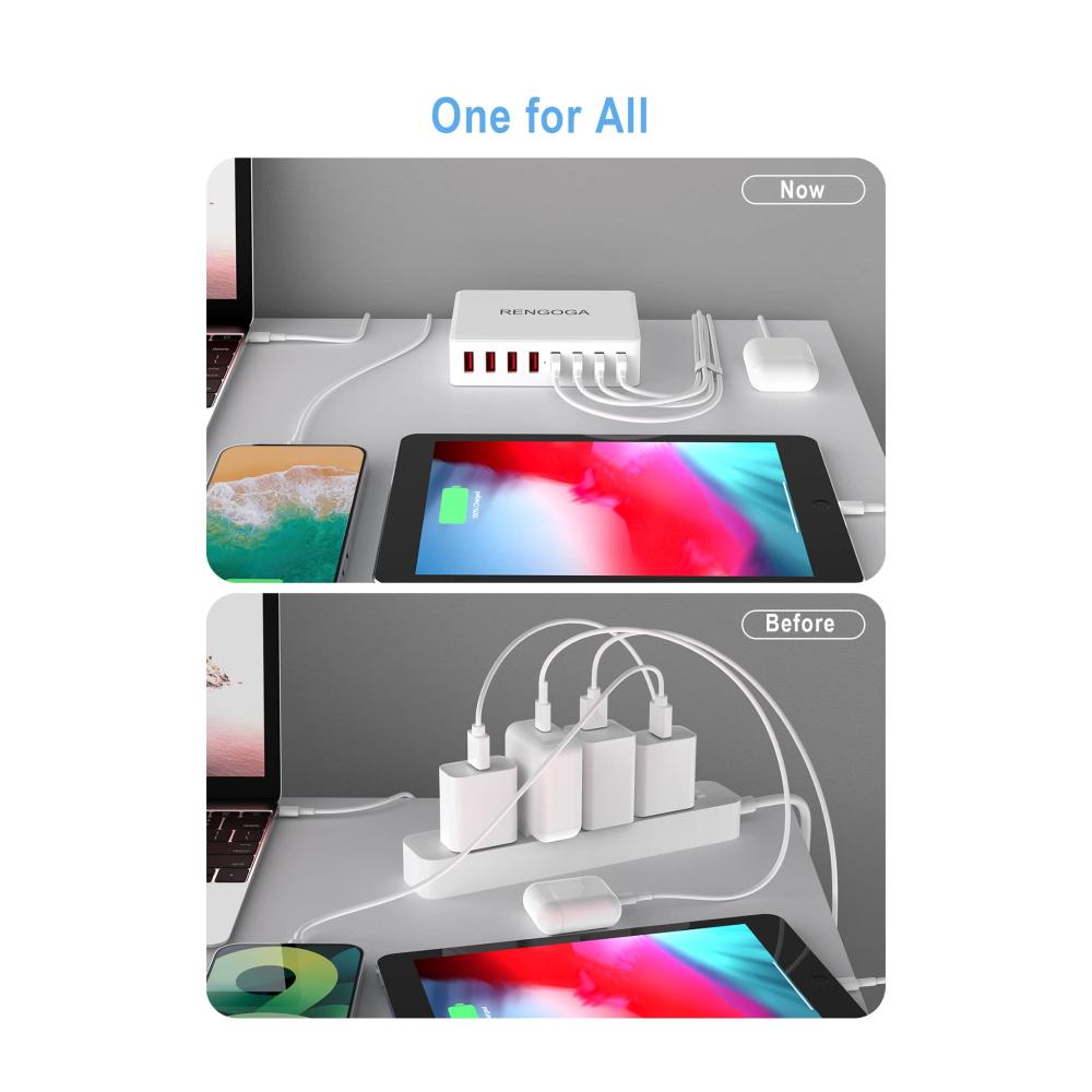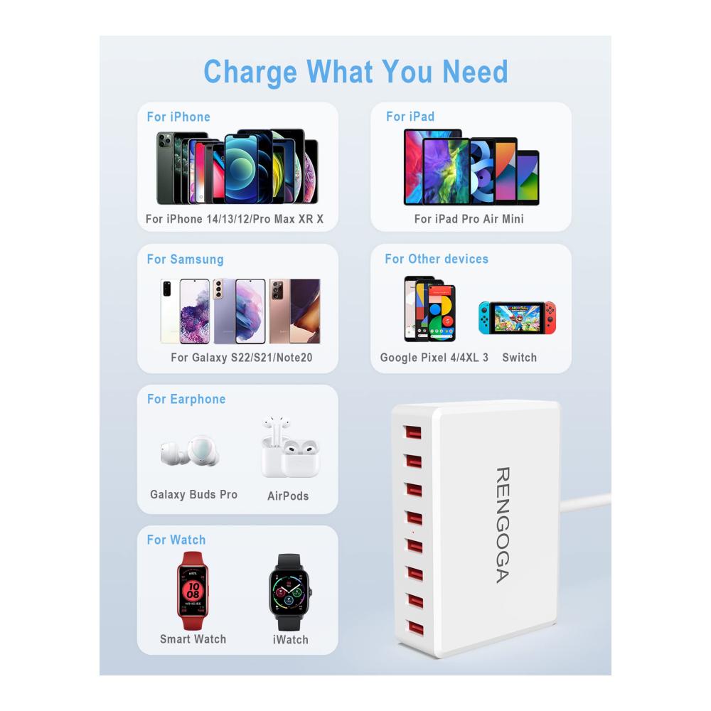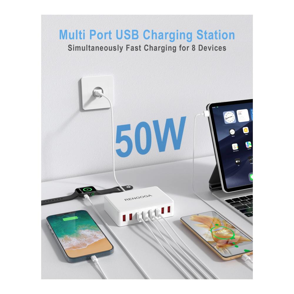 Effizientes USB Ladegerät Mehrfach: Die RENGOGA USB Ladestation 50W unterstützt Mehrere Schnellladeprotokolle für schnelles Laden, ideal für alle Ihre Geräte, einschließlich iPhone, iPad, Samsung Galaxy, Pixel und Huawei.
