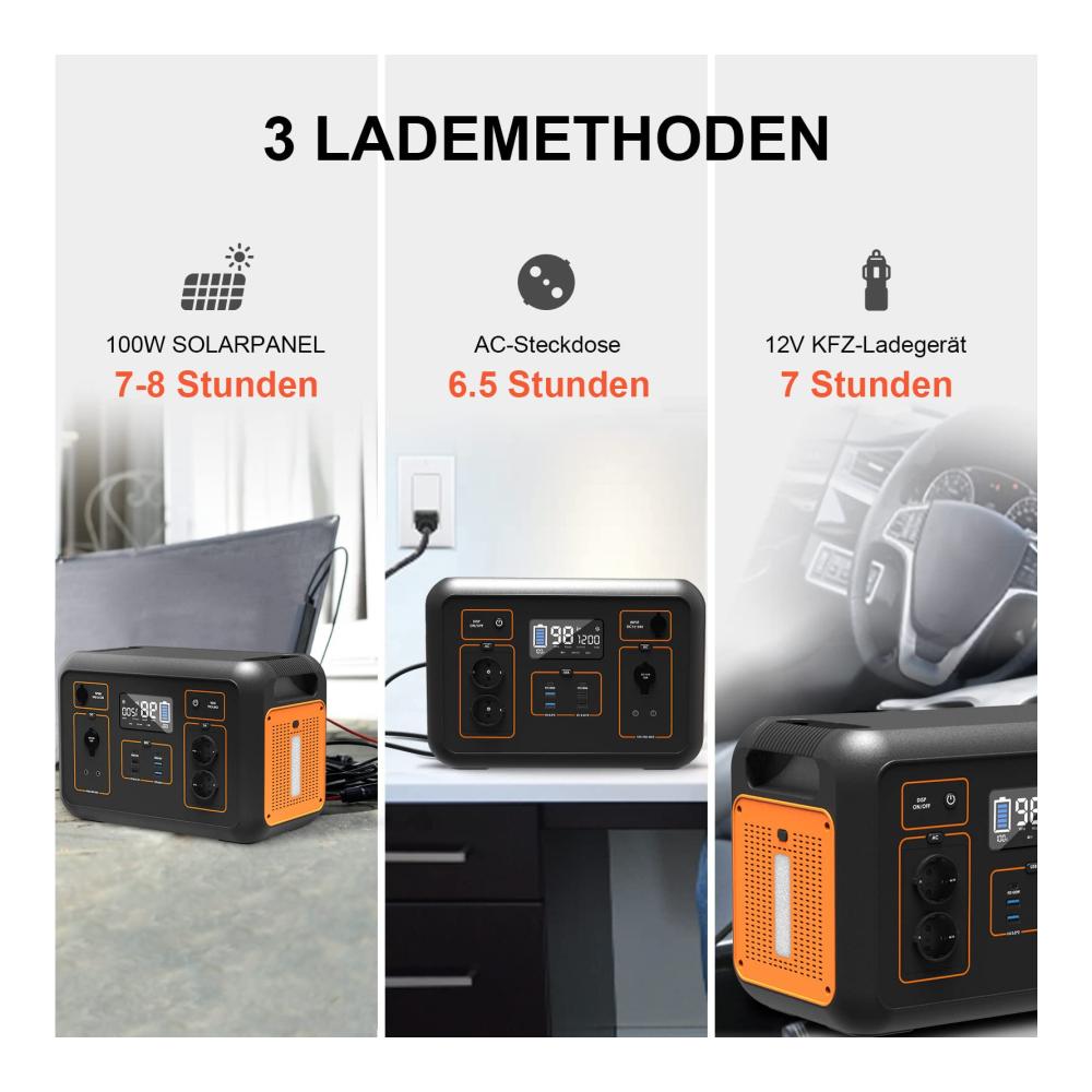 - Ladezeit: 7-9 Stunden mit Solarenergie, 6,5-7,5 Stunden über AC, 11,5-12,5 Stunden über 12V-Autoladung