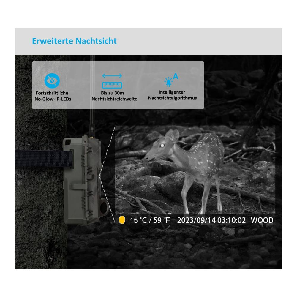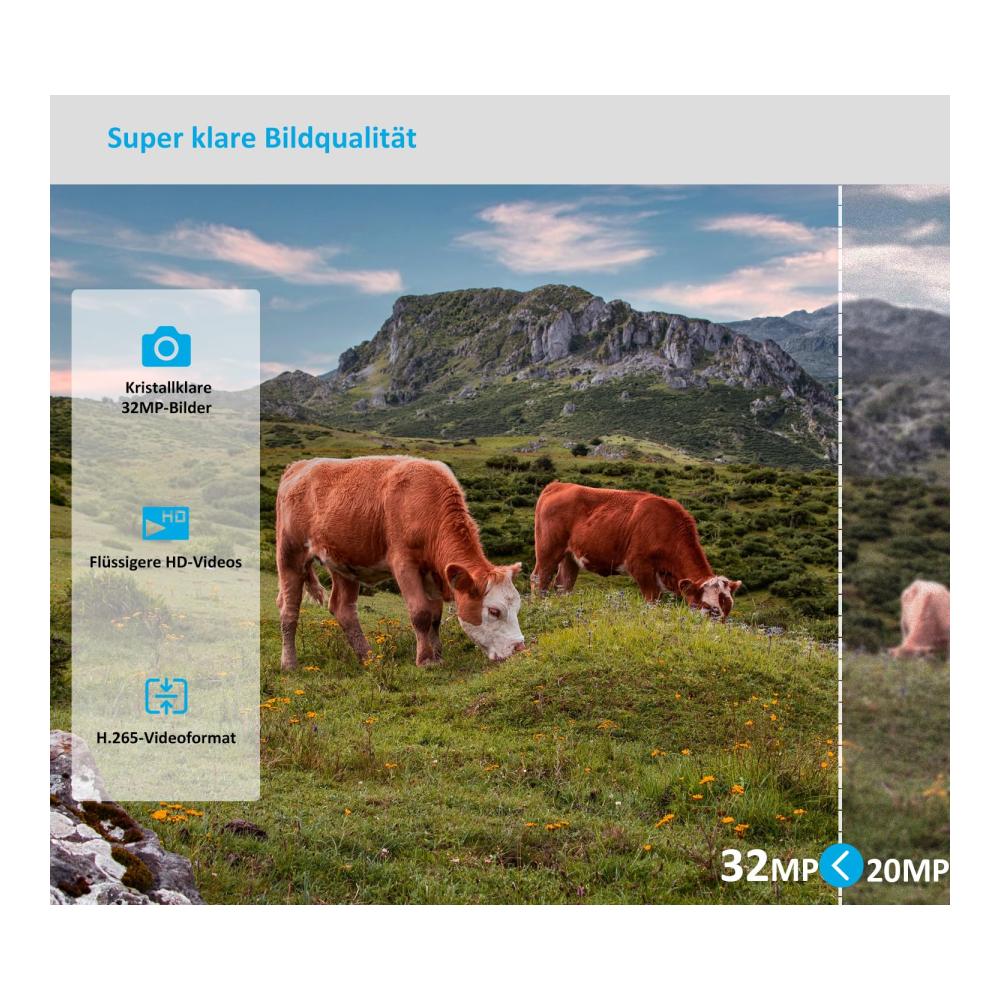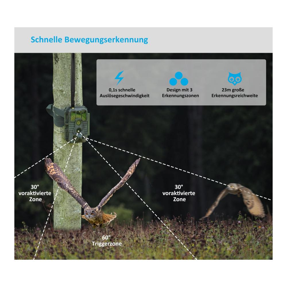 HD-Bild und -VideoDie Kamera erfasst kristallklare 32-MP-Bilder und flüssigere HD-Videos mit Audio. Die Videos werden im H.265-MP4-Format komprimiert, wodurch die Dateigröße und Übertragungszeit erheblich reduziert werden, was mehr Batterieleistung spart. | Unsichtbare NachtsichtDie 940-nm-Infrarot-Technologie hält Ihre Kamera nachts unsichtbar. Intelligente Infrarot-Beleuchtungstechnologie, fortschrittliche optische Linse und Bildsensor arbeiten zusammen, um klare Nachtsicht ohne Verwischen und Ausbleichen zu erzeugen. | Schnelle AuslösegeschwindigkeitDie Kamera verfügt über 3 PIR-Sensoren und voraktivierten Technologie für eine ultrakurze Auslösegeschwindigkeit von 0,1 Sekunden und schnelle systemweite Optimierung für eine Erholungszeit von 0,5 Sekunden, um sicherzustellen, dass Sie keine schnell bewegenden Tiere verpassen. Sie eignet sich ideal für die Hirschjagd, Wildbeobachtung oder Sicherheitszwecke. |