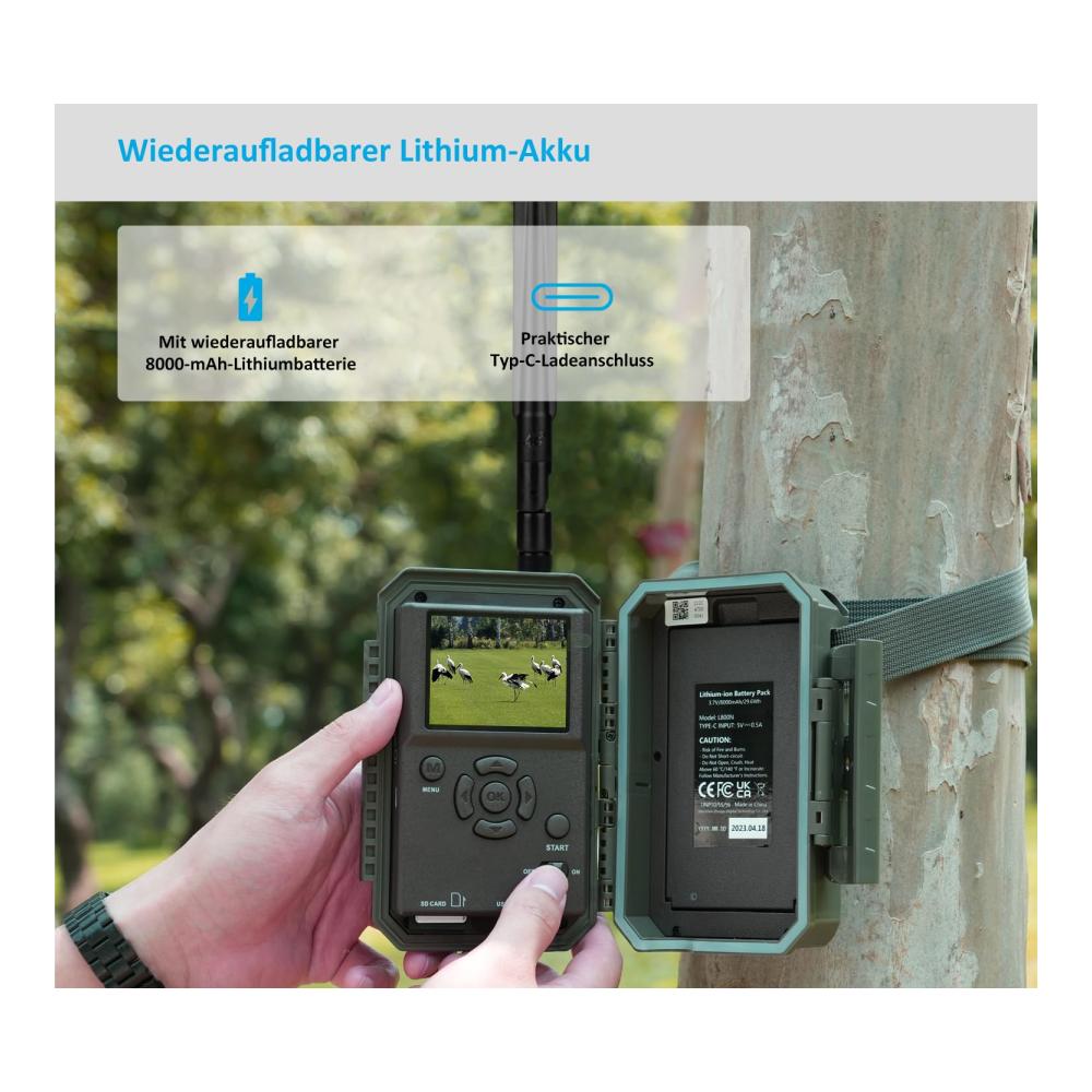 Wiederaufladbarer Akku mit großer Kapazität: Die Meidase S960 4G-Wildkamera ist mit einem wiederaufladbaren 8000-mAh-Lithium-Akku ausgestattet, der eine längere Kameranutzung ermöglicht, ohne dass häufig Einweg-AA-Batterien ausgetauscht werden müssen. Der Akku ist mit einem Typ-C-Ladeanschluss ausgestattet, der ein äußerst komfortables Ladeerlebnis bietet.