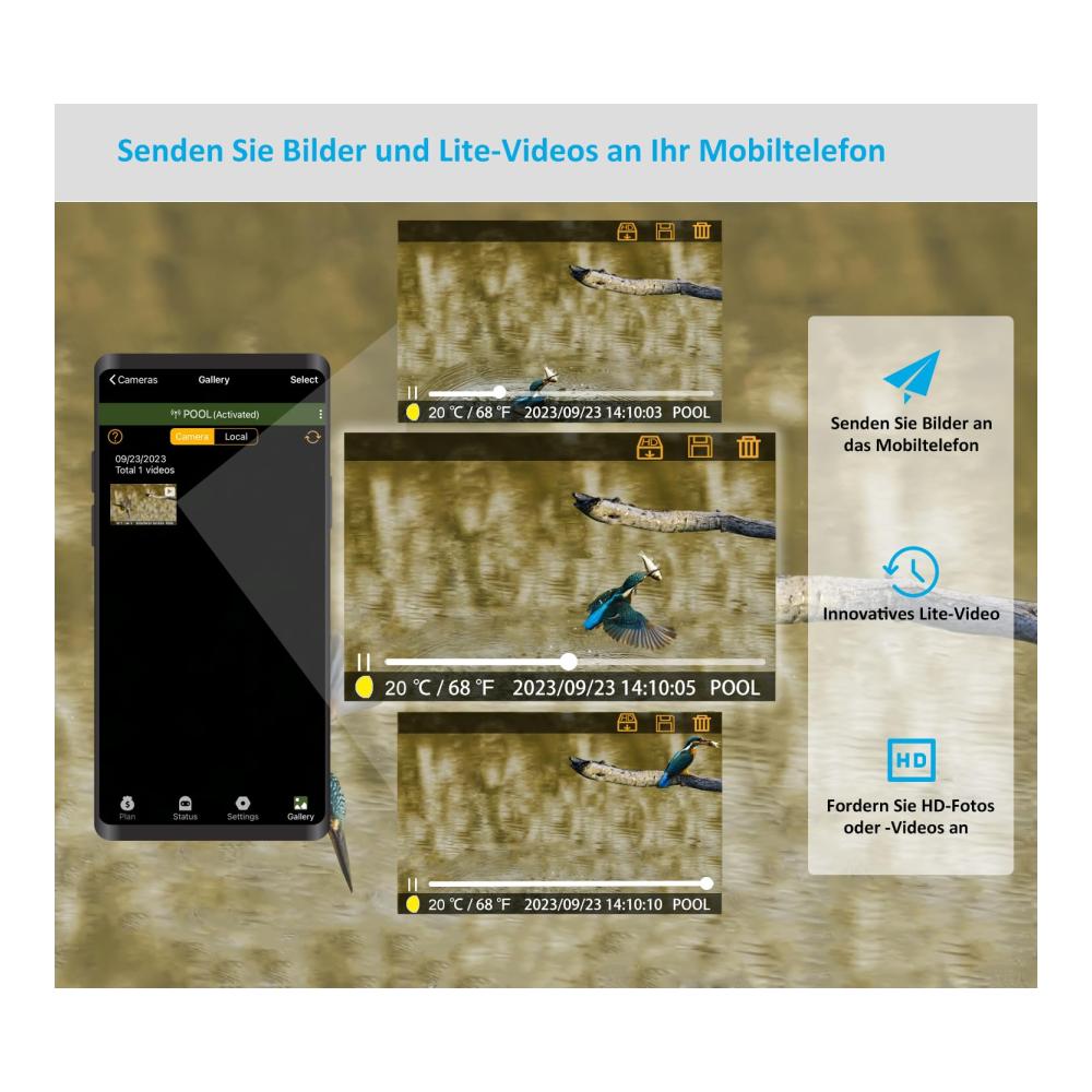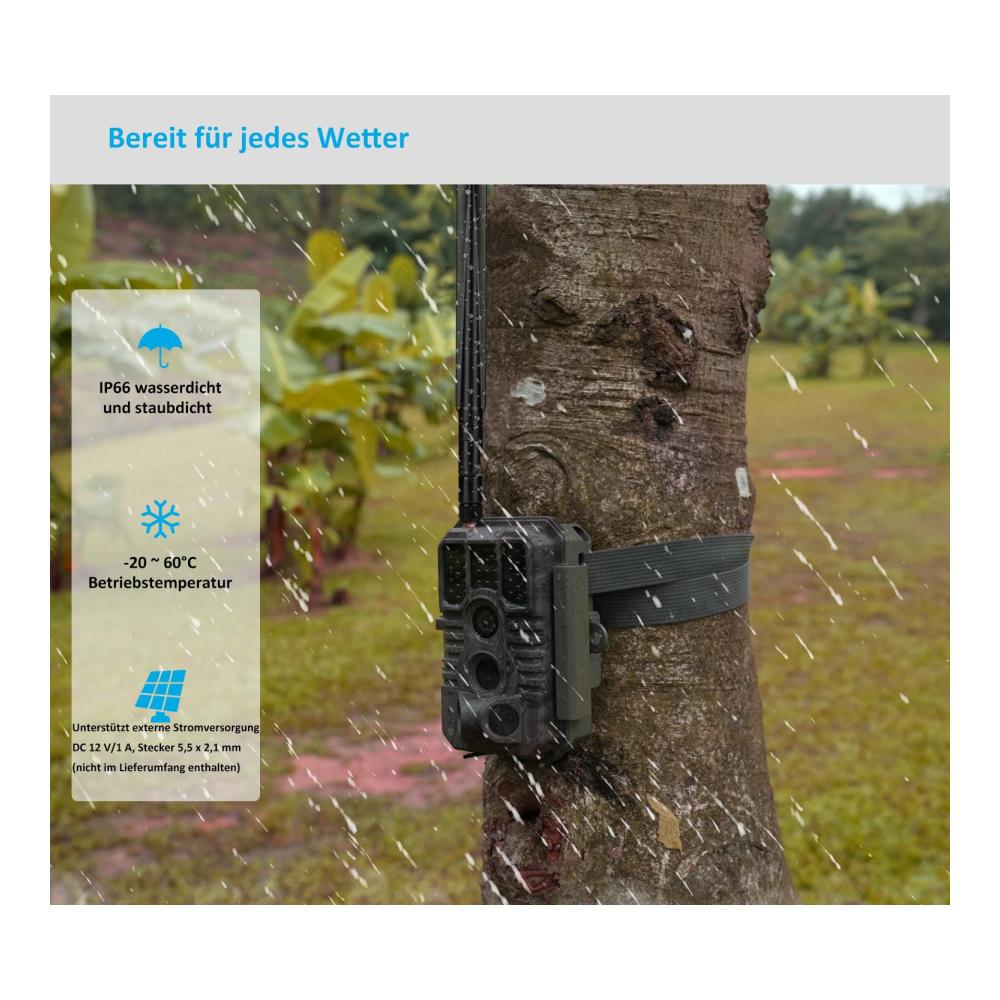 Stabile 4G-Übertragung: Beinhaltet eine kostenlose SIM-Karte und unterstützt die wichtigsten Mobilfunknetzbetreiber in der EU. Die Auto-Connect-Technologie erkennt automatisch das stärkste Signal in mehreren Netzwerken und verbindet es. Die Kamera kann nach jeder Aufnahme zeitnah oder nach einem festgelegten Zeitplan Fotos an Ihr Telefon senden.