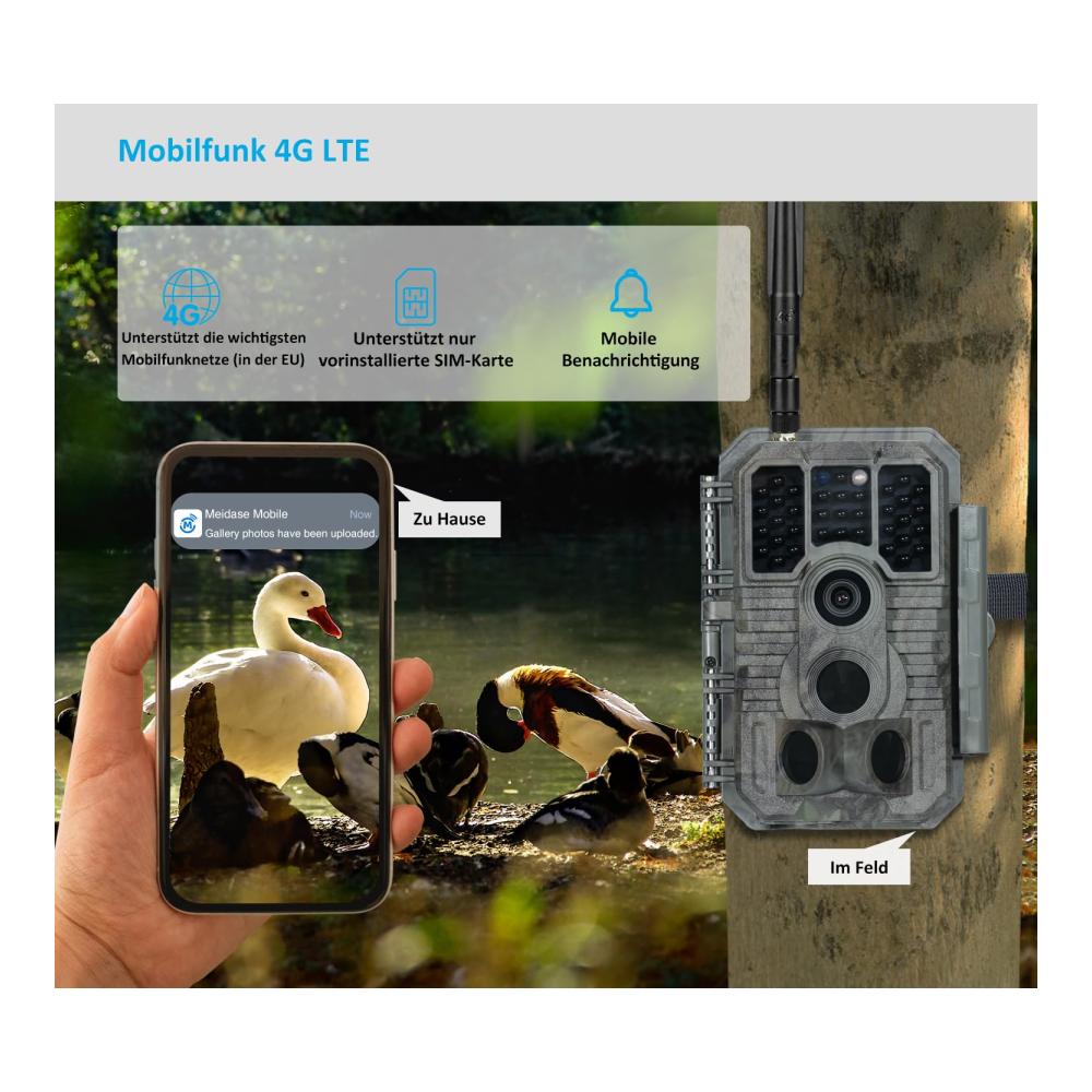 Die Meidase S960 ist eine 4G LTE-Mobilfunk-Jagdkamera der neuen Generation mit einem integrierten Mobilfunkmodul, das eine Fernverbindung und -bedienung über eine spezielle App namens „Meidase Mobile“ ermöglicht. Die Kamera kann Bilder gemäß dem in der App angegebenen Übertragungsplan an Ihr Mobiltelefon senden.