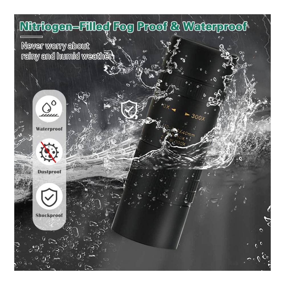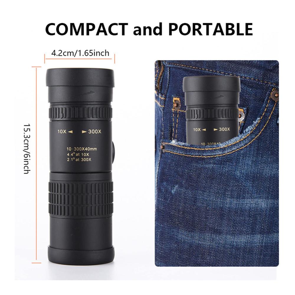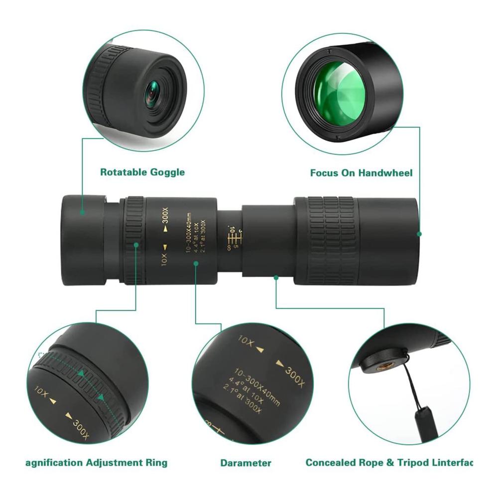 • Erleben Sie mit dem Monokularen Teleskop 10-300×40 HD eine neue Dimension der Naturbeobachtung. Dieses hochwertige Monokular ist perfekt geeignet für Vogelbeobachtung, Camping, Jagd, Ballspiele und Konzerte. Dank des integrierten Smartphone-Halters und Stativs können Sie Ihre Entdeckungen problemlos festhalten und teilen. Mit seiner wasserdichten Konstruktion trotzt es den Elementen und bietet klare HD-Sicht für ein unvergleichliches Erlebnis. Entdecken Sie die Welt um sich herum mit dem Monokularen Teleskop.