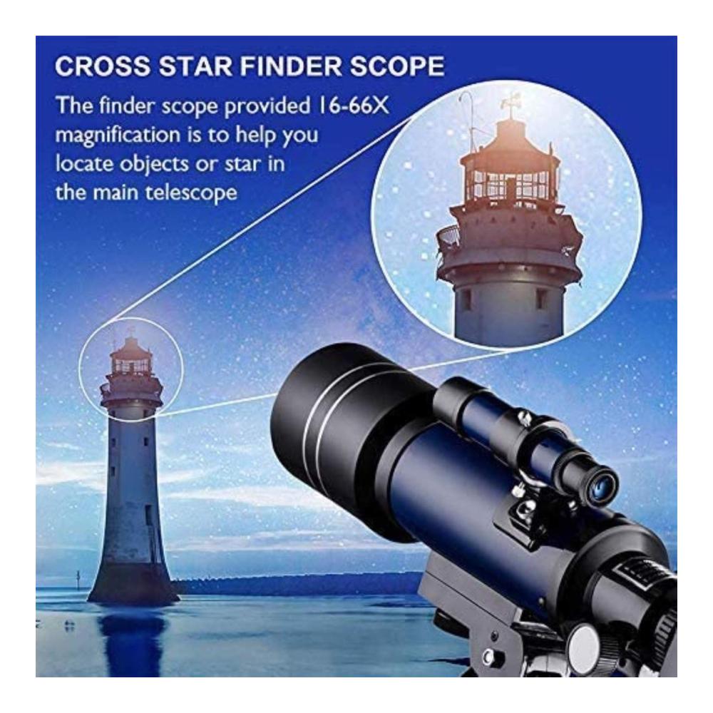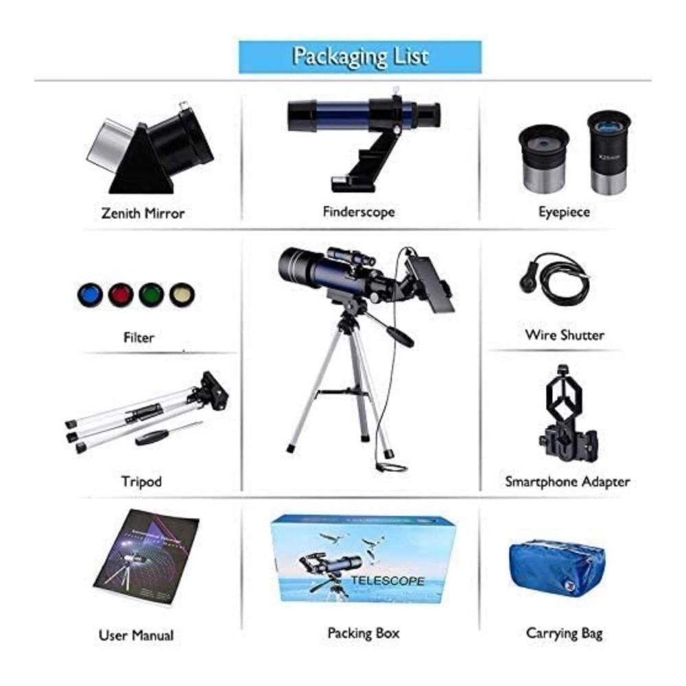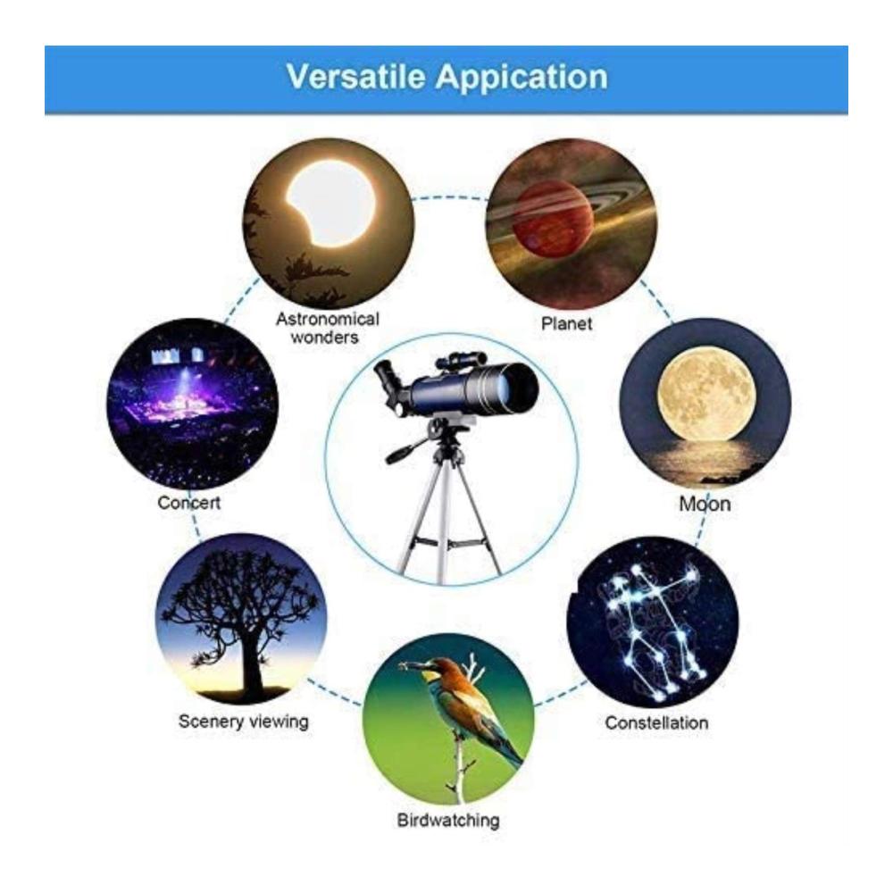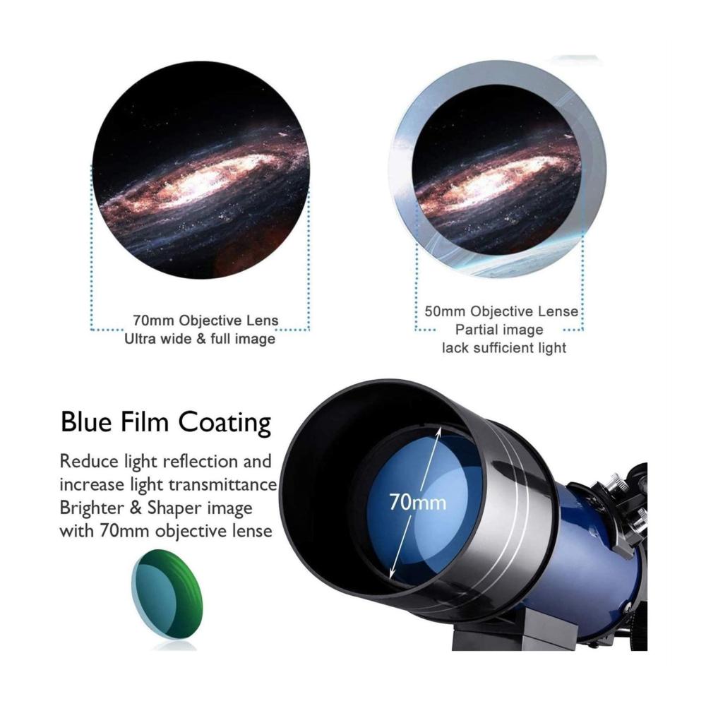 Mit einer 70 mm großen Blende Objektivlinse und 400 mm Brennweite bietet dieses Teleskop eine größere Vergrößerung und einen stabileren Multiplikator. Das Teleskop enthält K6 K25 Okulare und einen Metall-Mondfilter für eine optimale Beobachtung, besonders bei hoher Helligkeit des Vollmondes.