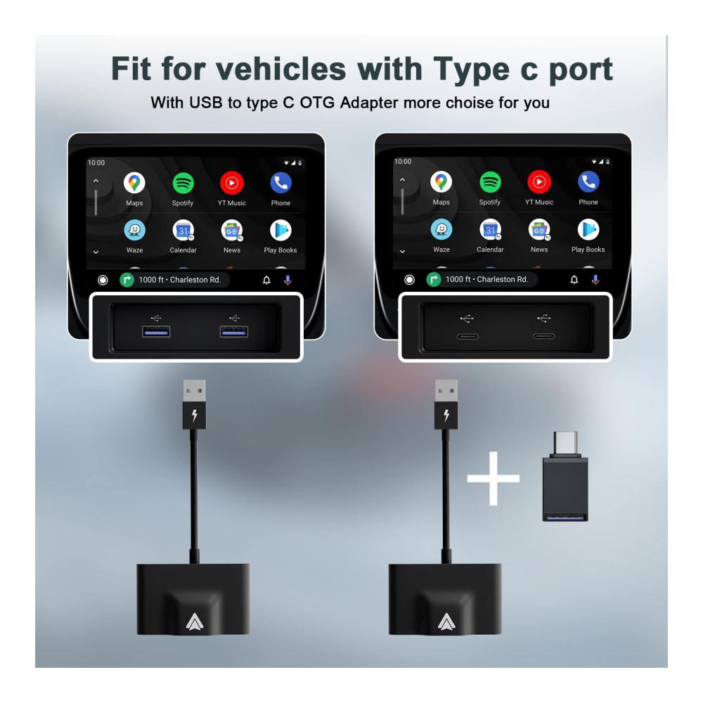 Mini und kompakt: Das leichte und schlanke Design dieses Android-Auto-Adapters nimmt nicht viel Platz in Ihrem Auto ein. Halten Sie Ihr Auto sauber, bequem und frei. Ein USB auf USB C Adapter ist im Lieferumfang enthalten, sodass dieser Android Autoadapter sowohl USB als auch USB C Autoanschluss Zugang unterstützen kann.