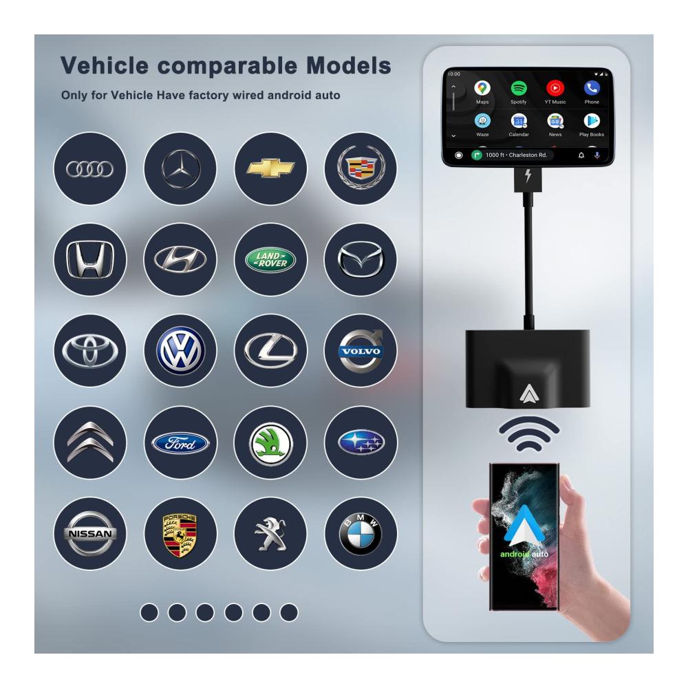 Anwendungsbereich: Der kabellose Android-Autoadapter unterstützt nur Android 6.0 und höher mobile Systemversionen. Der kabellose Android Autoadapter ist mit über 600 Fahrzeugmodellen kompatibel. Bitte beachten Sie, dass Ihr Auto mit Android-Autofunktionen ausgestattet sein muss.