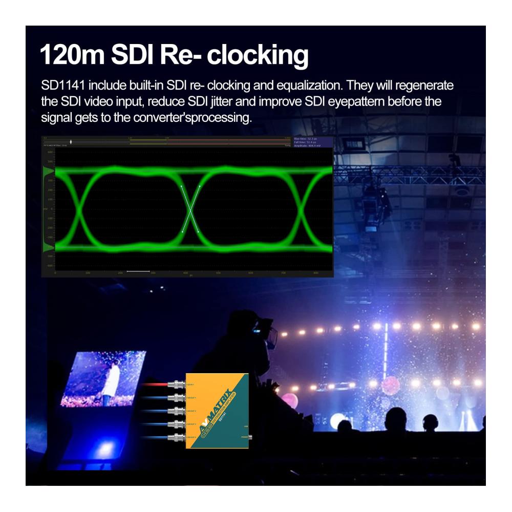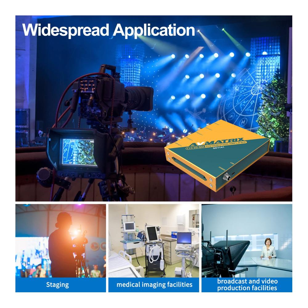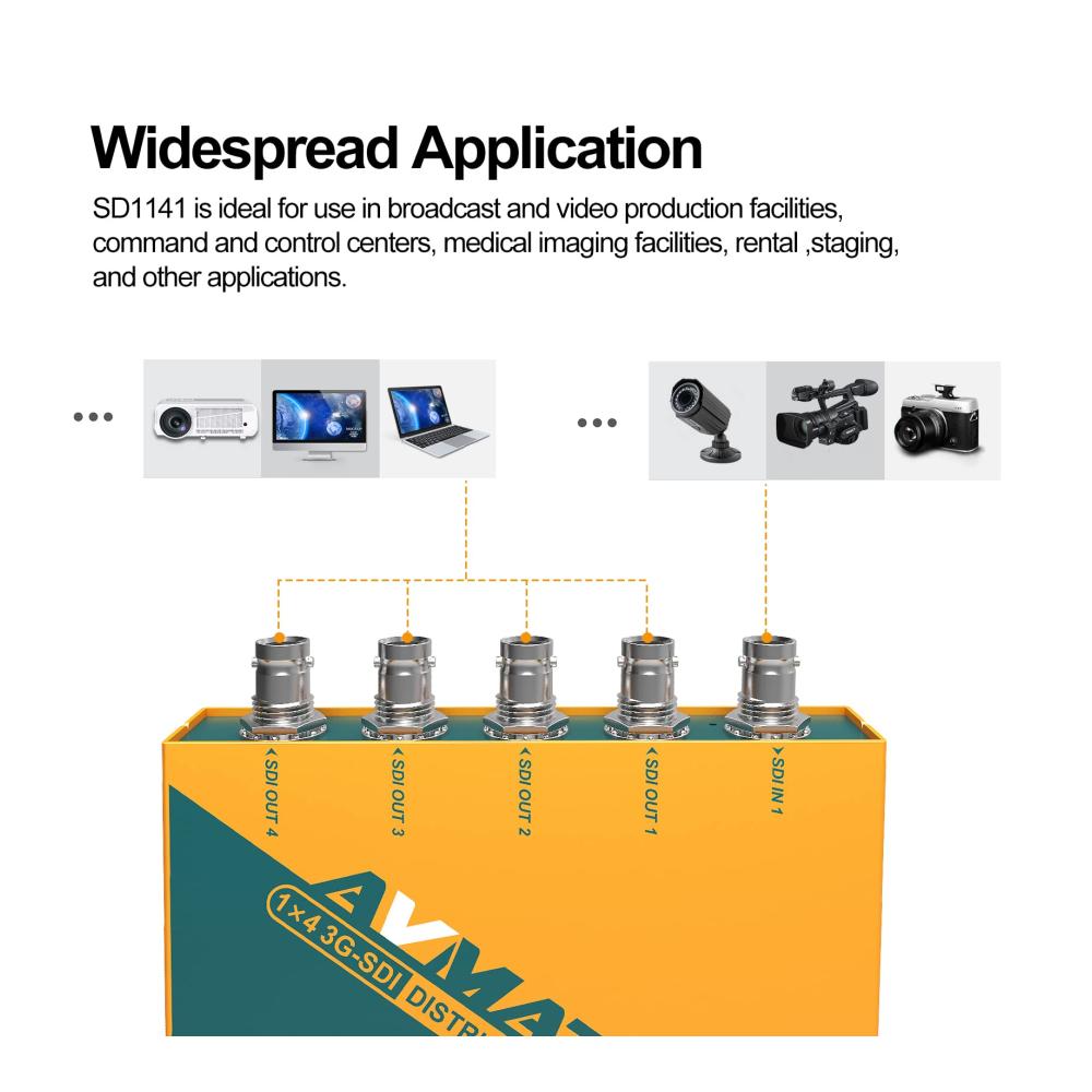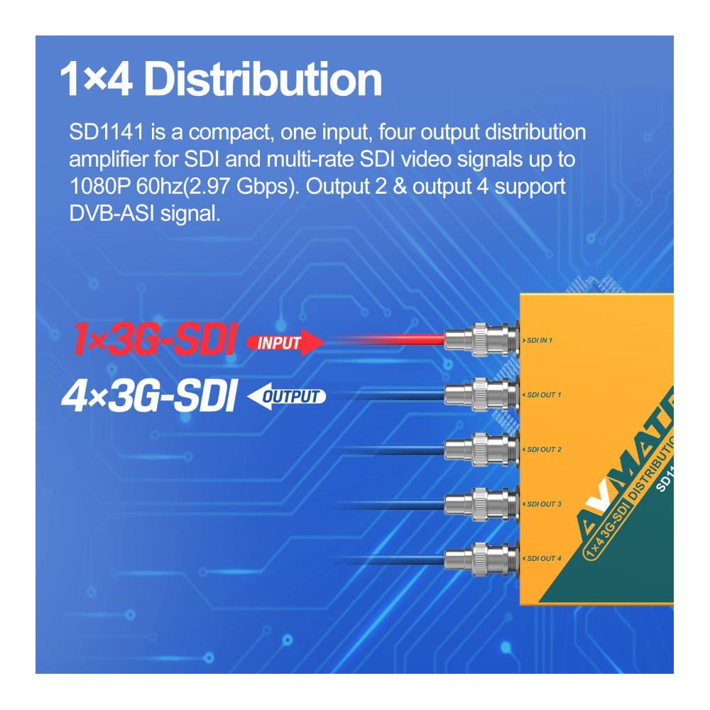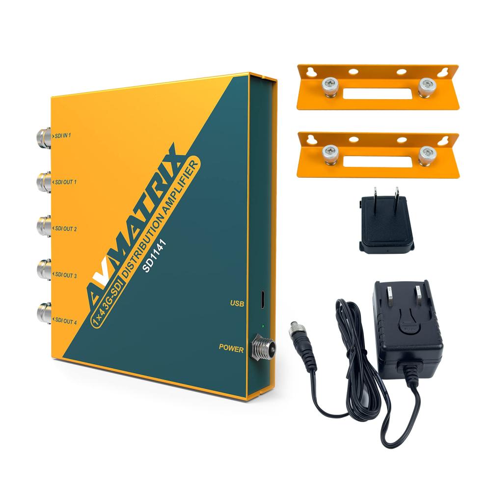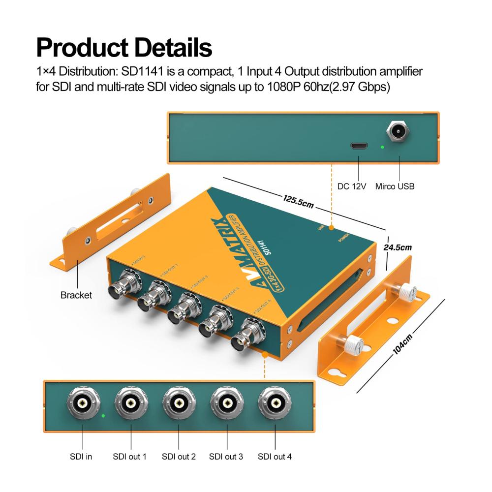 Entdecken Sie den Avmatrix SD1141 Verteilungsverstärker: Ein kompakter Verteilungsverstärker mit einem Eingang und vier Ausgängen für SDI- und Multirate-SDI-Videosignale bis zu 1080P 60 Hz (2,97 Gbit/s). Unterstützt automatischen Kabelausgleich, Signal-Retiming und DVB-ASI-Signal für erweiterte Konnektivität. Ideal für Rundfunk- und Videoproduktionsanlagen, medizinische Bildgebung und mehr