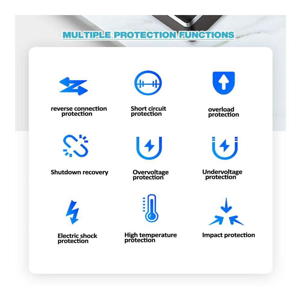£Komplettschutz-Spezialität: Der Wechselrichter gewährleistet erstklassigen Schutz mit erweiterten Funktionen, wie z. B. Wiederherstellung nach Abschaltung und Überlastschutz. Es verfügt außerdem über mehrere Funktionen für Überspannungs-/Unterspannungs-, Kurzschluss-, Stromschlag-, Hochtemperatur- und Aufprallschutz.