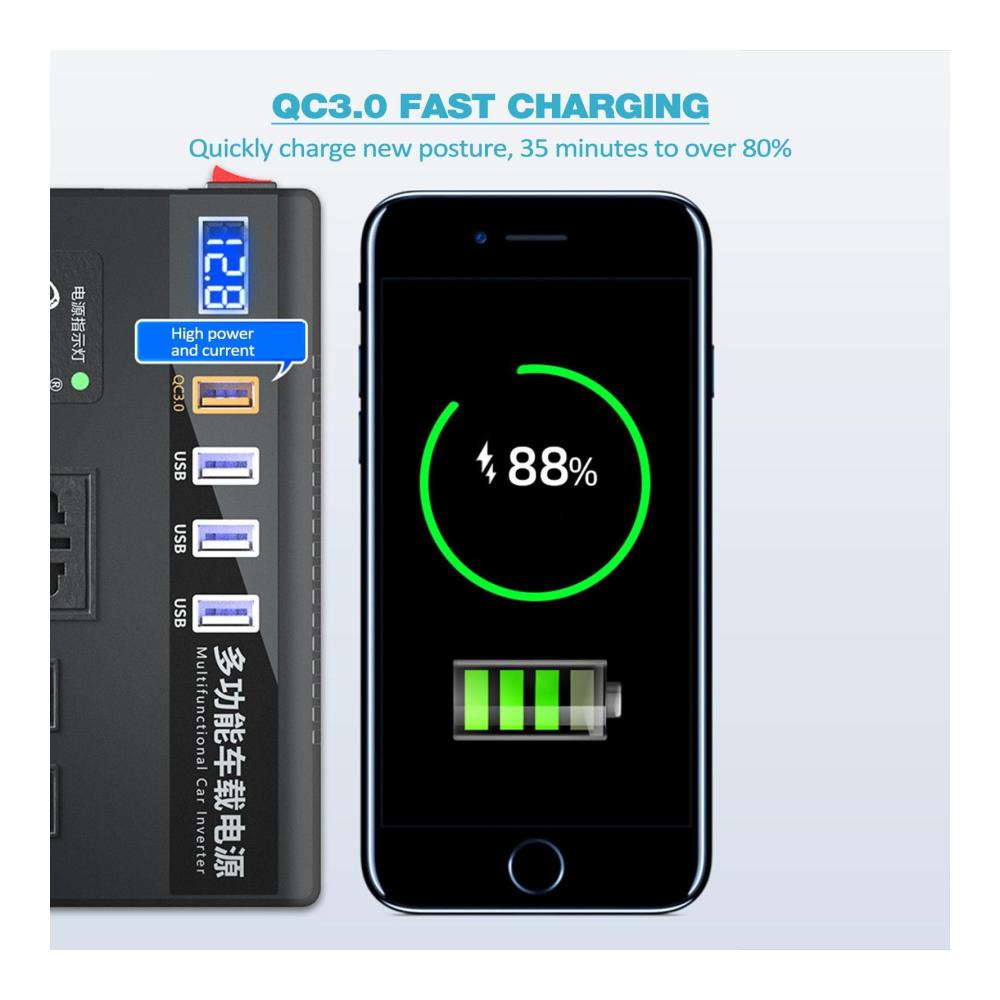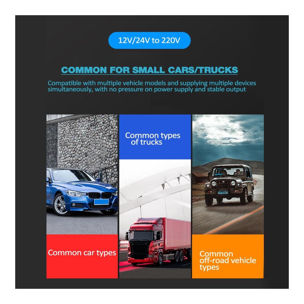 £Praktische Strominvertierung: Versorgen Sie Ihre Elektrogeräte mühelos unterwegs mit unserem Wechselrichter, der über 3 220-V-Steckdosen, 3 USB-Ladeanschlüsse, einen QC3.0-Schnellladeanschluss und die Möglichkeit verfügt, 12 V und 24 V Gleichspannung in 220 V Wechselspannung umzuwandeln für nahtlose Kompatibilität.