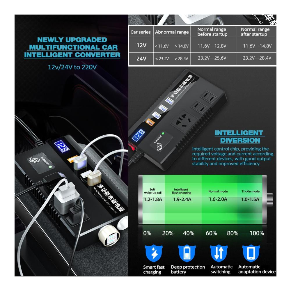 Nehmen Sie Ihr Auto mit diesem hocheffizienten Wechselrichter mit auf die Reise! Mit einem QC3.0-Schnellladeanschluss und Hochtemperaturschutz ist dieser DC-AC-Wandler perfekt für jedes Fahrzeug. Genießen Sie den Komfort, Ihre Geräte auch unterwegs problemlos aufzuladen.Spezifikationen:Produktname: Multifunktions-Auto-NetzteilMaterial: Flammhemmendes ABS-MaterialProduktgröße: ca. 15,8 x 9 x 3,2 cmKabellänge: ca. 100 cmEingangsspannung: 12V/24V universalAusgangsspannung: 12–220 V, 24–220 V GleichstromUmwandlungseffizienz: etwa 90 % oder mehr12V-Nutzungsbereich: 11,6V-14,8V24V-Nutzungsbereich: 23,2V-28,4VPackliste:1 x multifunktionaler Auto-Wechselrichter