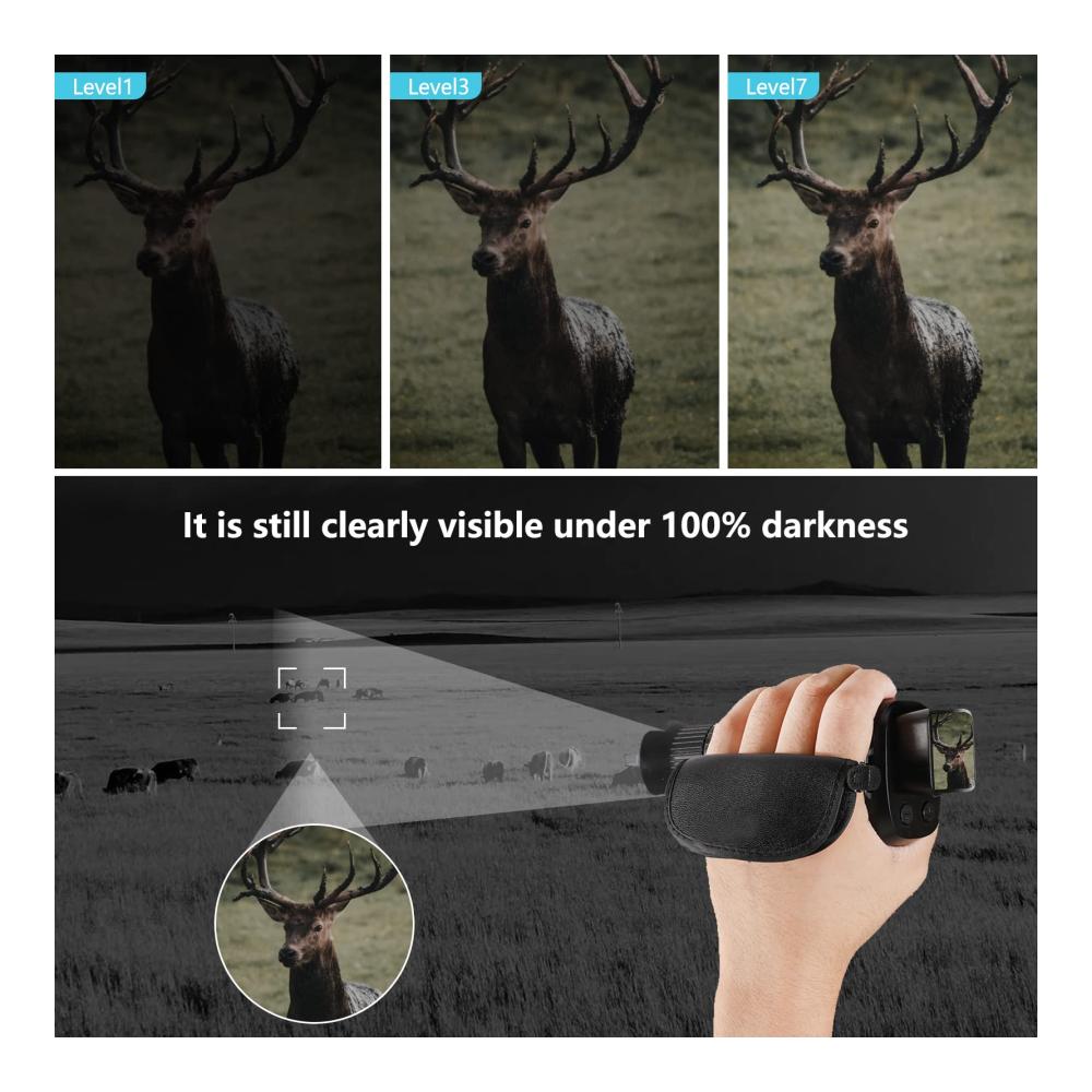 Vergrößerung: Leicht zu sehen, ca. 198 m Entfernung. Unsere Nachtsichtbrille beinhaltet 5-fach digitalen Zoom und 7-fach Infrarot-Einstellung, um sicherzustellen, dass Sie alles sehen können. 7 einstellbare IR-Helligkeit sorgen für optimale Sichtbarkeit bei Nacht. Je höher das Infrarot-Lichtgetriebe eingestellt wird, desto weiter und klarer ist die Beobachtung in der Nacht.