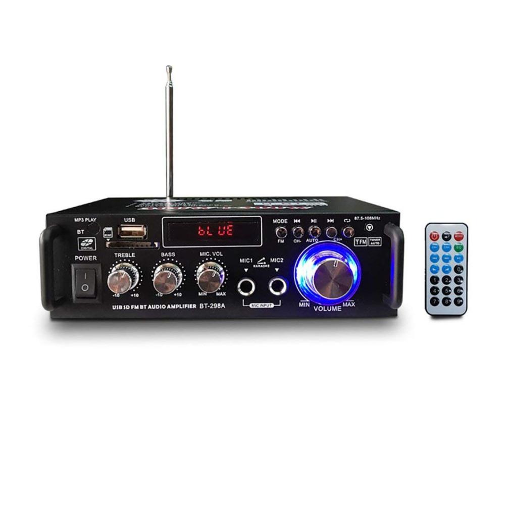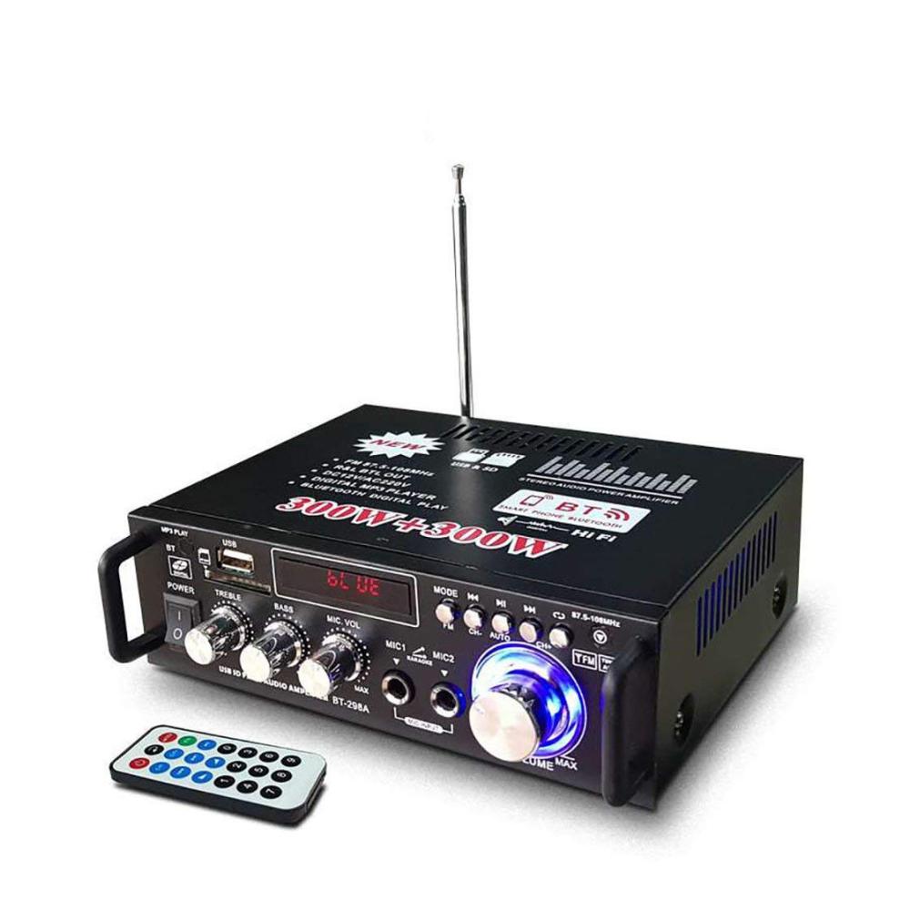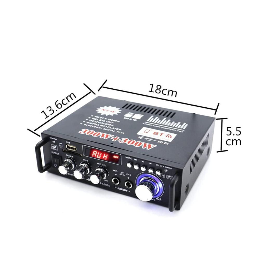 Funktionen: 1. Mini HIFI digitaler Bluetooth Audio Audio Leistungsverstärker. 2. Eingebautes LCD-Display mit Hintergrundbeleuchtung. 3. SDs-Karte, U-Disk, Wiedergabe im MP3-Format, Unterstützung der drahtlosen Bluetooth-Verbindung. 4. Unterstützt FM-Stereoradio. 5. Zwei Mikrofoneingangssteckplätze, Karaoke-System zu Hause oder im Auto. 6. Mit Höhen-, Tiefen- und Lautstärkeregler sehr einfach zu bedienen. 7. Geringe Verzerrung liefert einen klareren, stärkeren und kraftvolleren Klang. 8. Zwei-Kanal-Ausgang. 9. Mit Fernbedienungsfunktion. 10. DC / AC-Stromversorgung, Geeigneter Gegner zu Hause oder Ihr Auto. Technische Daten: Colo: Schwarz Modell: 298A Eingangsspannung: AC 220V / DC12V (im Auto) Bluetooth: Unterstützung Ausgangsleistung: 80W 80W Spitzenleistung: 300W 300W Kanal: 2 CH Lastimpedanz: 4-16Ω SNR:> 92 db FM-Frequenz: 87.5-108 MHz Verformungsrate: 0,05% Frequenz: 10Hz-20KHz Empfindlichkeit: 0.25 mV – 220 mV RC-Netzteil: CR2052-Batterie (eingebaut) Größe: Ca. 18 x 15.5 x 5.5 cm Paket enthalten: 1 x Audioverstärker 1 x Fernbedienung