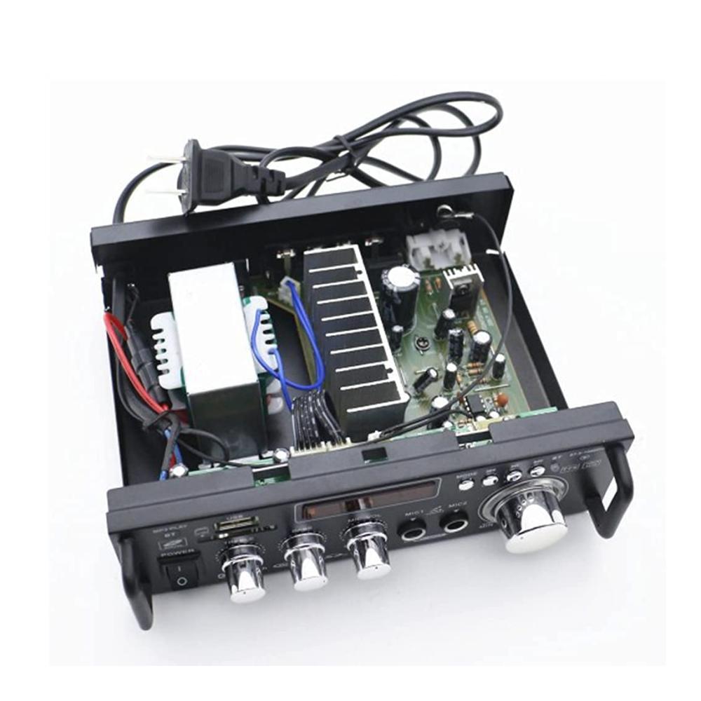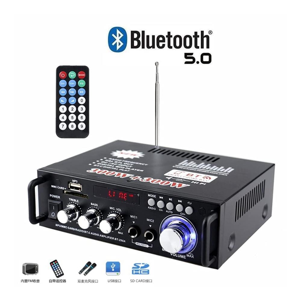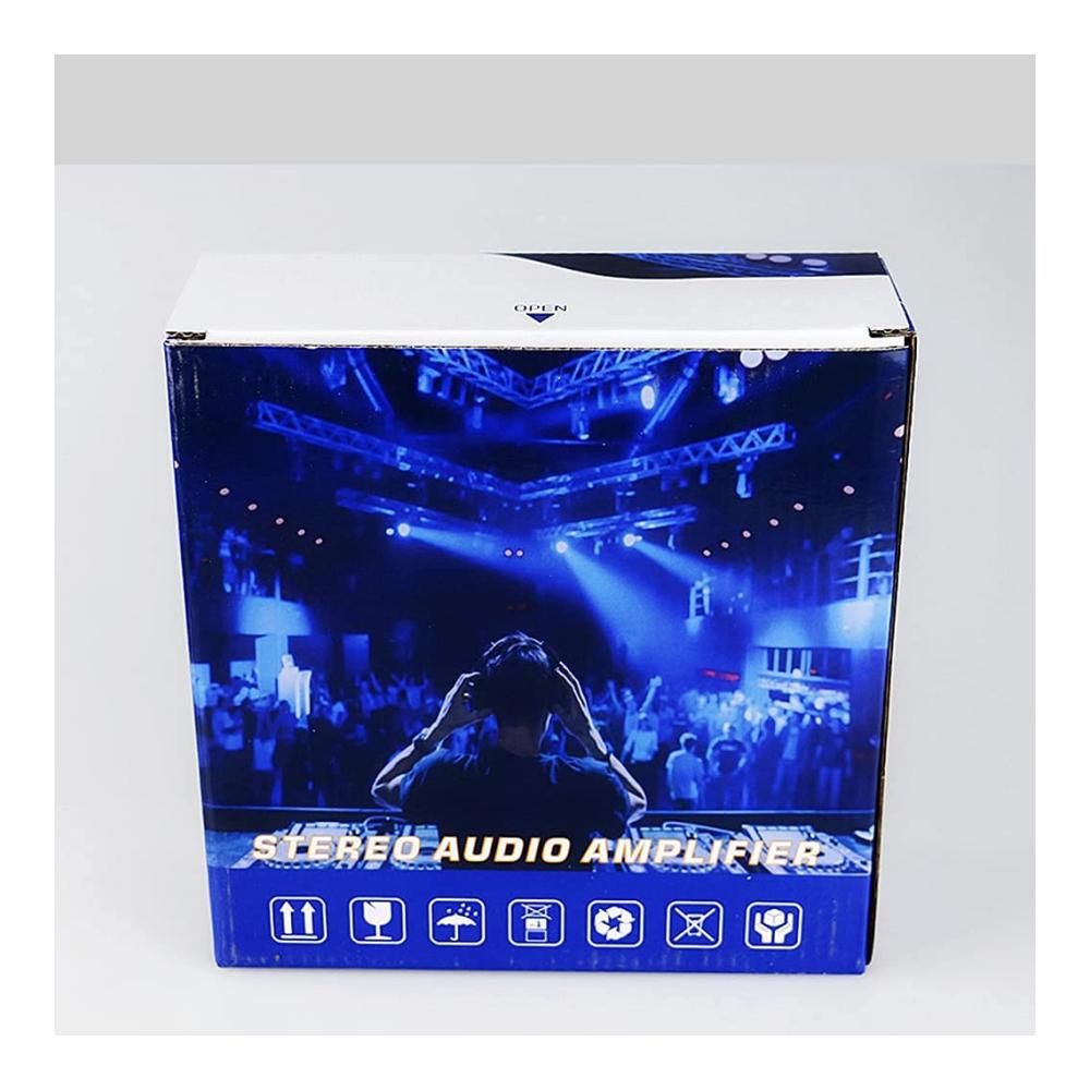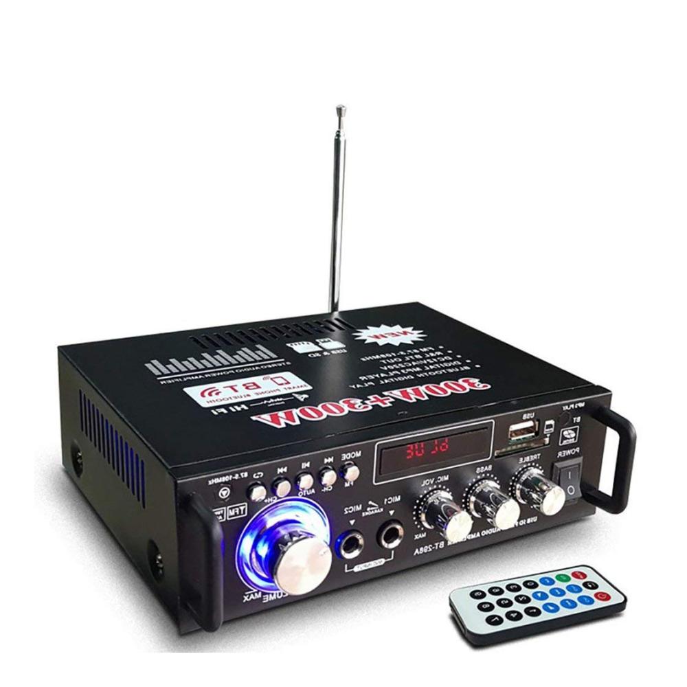 Funktionen: 1. Mini HIFI digitaler Bluetooth Audio Audio Leistungsverstärker. 2. Eingebautes LCD-Display mit Hintergrundbeleuchtung. 3. SDs-Karte, U-Disk, Wiedergabe im MP3-Format, Unterstützung der drahtlosen Bluetooth-Verbindung. 4. Unterstützt FM-Stereoradio. 5. Zwei Mikrofoneingangssteckplätze, Karaoke-System zu Hause oder im Auto. 6. Mit Höhen-, Tiefen- und Lautstärkeregler sehr einfach zu bedienen. 7. Geringe Verzerrung liefert einen klareren, stärkeren und kraftvolleren Klang. 8. Zwei-Kanal-Ausgang. 9. Mit Fernbedienungsfunktion. 10. DC / AC-Stromversorgung, Geeigneter Gegner zu Hause oder Ihr Auto. Technische Daten: Colo: Schwarz Modell: 298A Eingangsspannung: AC 220V / DC12V (im Auto) Bluetooth: Unterstützung Ausgangsleistung: 80W 80W Spitzenleistung: 300W 300W Kanal: 2 CH Lastimpedanz: 4-16Ω SNR:> 92 db FM-Frequenz: 87.5-108 MHz Verformungsrate: 0,05% Frequenz: 10Hz-20KHz Empfindlichkeit: 0.25 mV – 220 mV RC-Netzteil: CR2052-Batterie (eingebaut) Größe: Ca. 18 x 15.5 x 5.5 cm Paket enthalten: 1 x Audioverstärker 1 x Fernbedienung