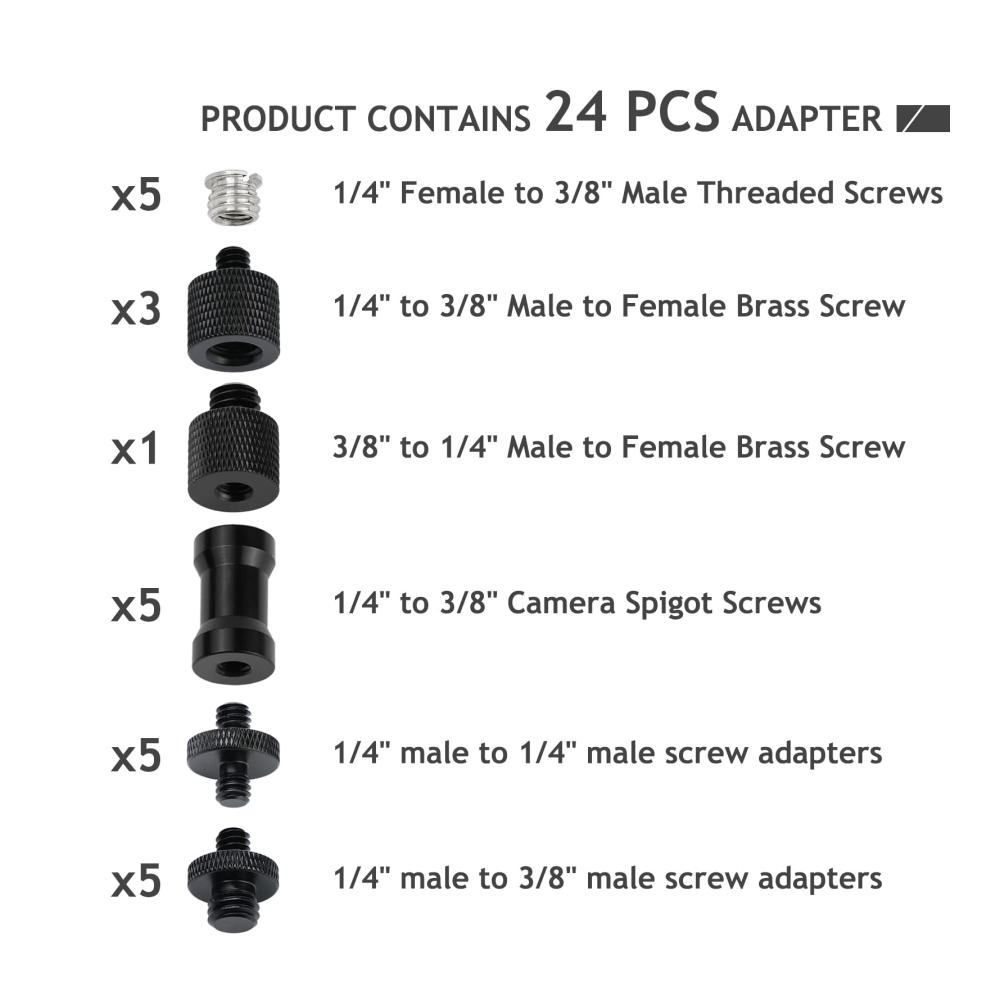 Einfach Zu Bedienen – Paket beinhaltet 1/4&34; männlich auf 1/4&34; männlich Schraube Adapter (5 Stück), 1/4&34; männlich auf 3/8&34; männlich Schraube Adapter (5 Stück), 1/4&34; weiblich auf 3/8&34; männlich Schrauben Adapter(5 Stück), 1/4&34; auf 3/8&34; Kamera Zapfenschrauben (5 Stück), 1/4&34; männlich auf 3/8&34; weiblich Schraube Adapter (3 Stück), 1/4&34; weiblich auf 3/8&34; männlich Schraube Adapter (1 Stück). Helfen Sie dabei, mehr Rig Kombination von Möglichkeiten und Freiheit bei Ihrem Fotoshooting zu gewinnen.