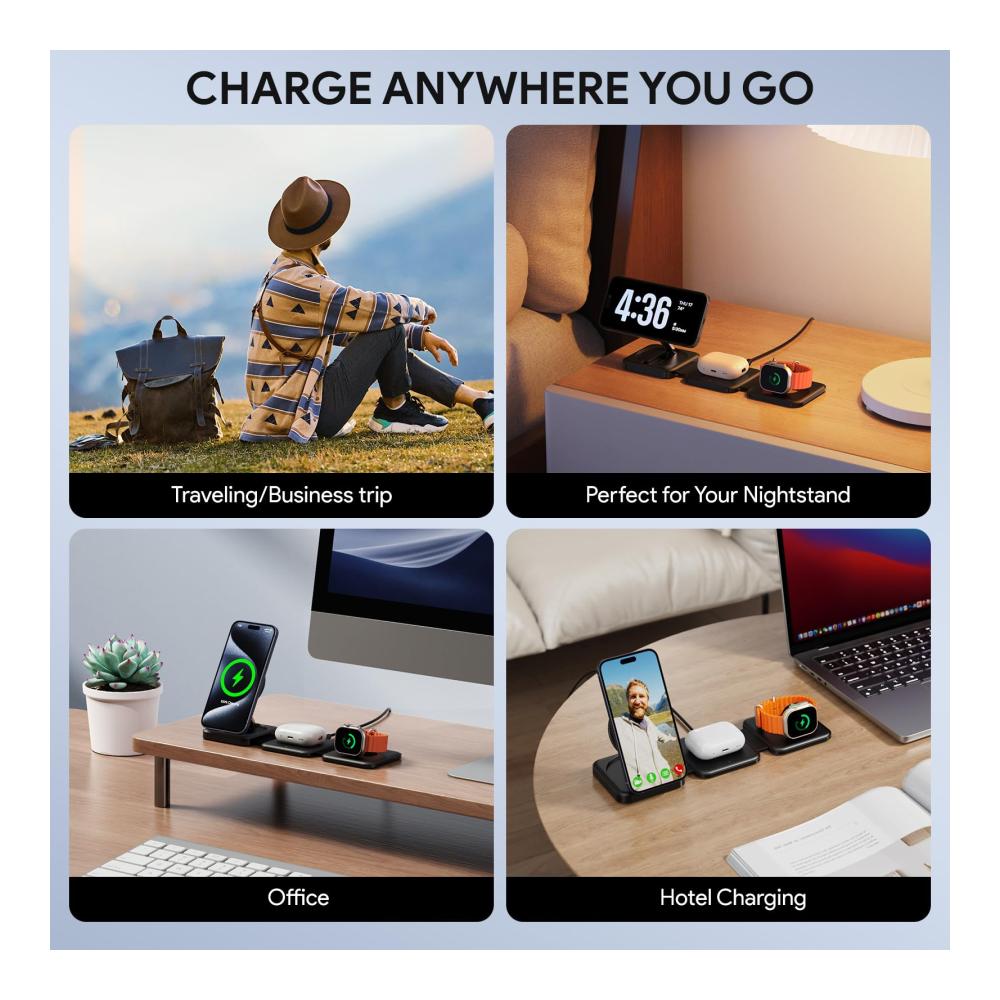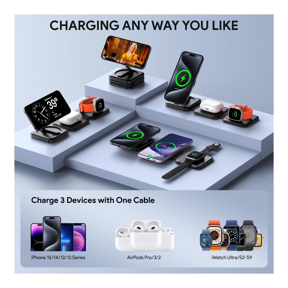 Die Ladestation ist mit verschiedenen Geräten kompatibel, darunter Apple Watch Series, iPhone 15/14/13/12 Modelle, MagSafe/Magnetische Hüllen, AirPods Pro 2, AirPods 3 und mehr. Die 3-in-1 Funktion ermöglicht das gleichzeitige Laden verschiedener Geräte, ohne dass zusätzliche Kabel benötigt werden.