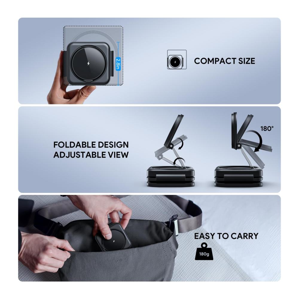 Die kompakte und faltbare Bauweise ermöglicht einfaches Verpacken und spart 80 % Platz. Nutzen Sie das Ladepad als verstellbaren Ladeständer oder falten Sie es zu einer handlichen Größe. Ideal für Nachttische, Reisen, Geschäftsreisen und den Einsatz in Flugzeugen oder Hotels.