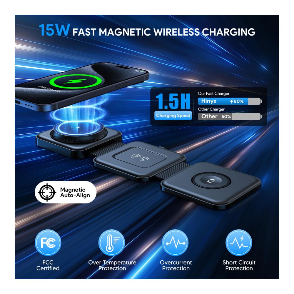 Tauchen Sie ein in die Zukunft des kabellosen Ladens mit der Hinyx 3-in-1 Mag-Safe Ladestation für iPhone. Diese faltbare, kabellose Ladestation ist kompatibel mit iPhone 15/14/13/12/11Pro Max, Apple Watch und Air Pods, und bietet eine effiziente Lösung für unterwegs.