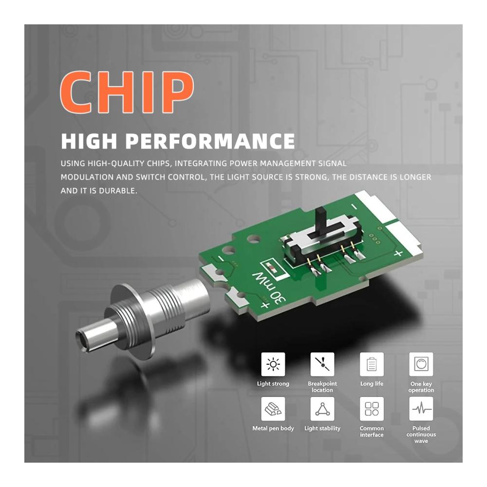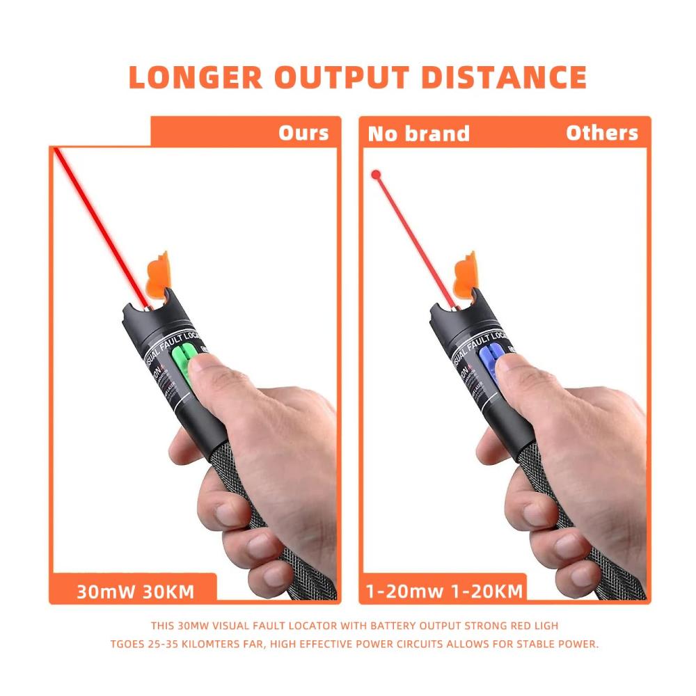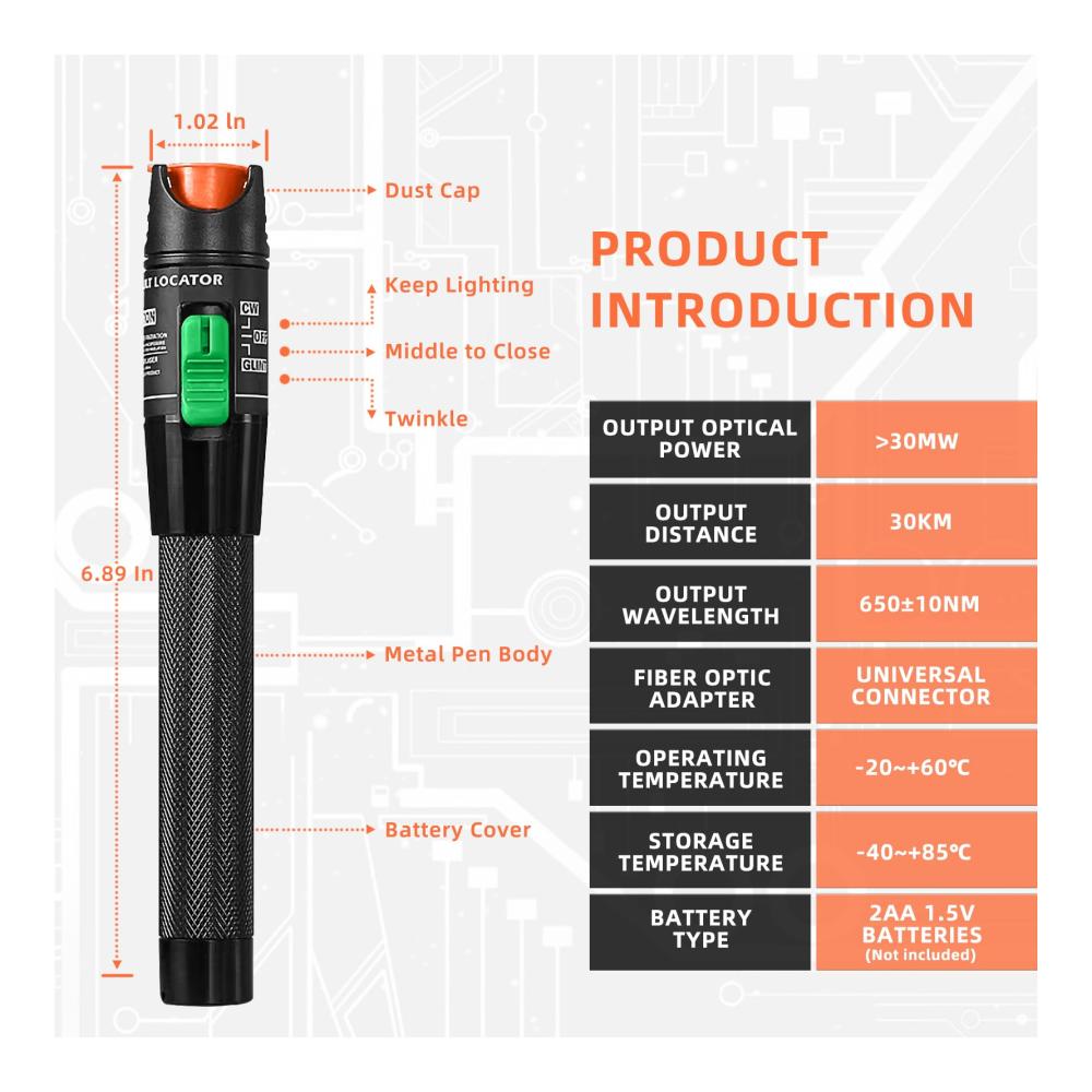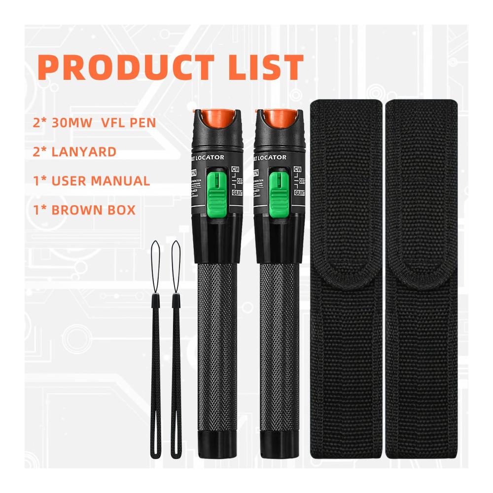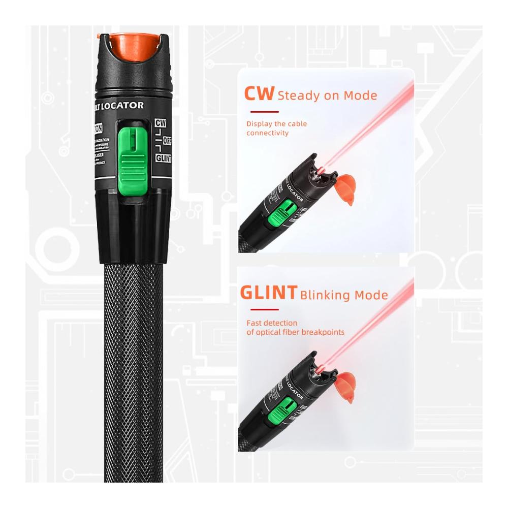 • Der Visual Fault Locator (VFL) von Qilnyeh verwendet leistungsstarkes sichtbares Licht mit einer Wellenlänge von 360 bis 670 nm, das in eine Faser eingestrahlt wird, um Fehler in Glasfaserkabeln visuell und direkt zu lokalisieren.