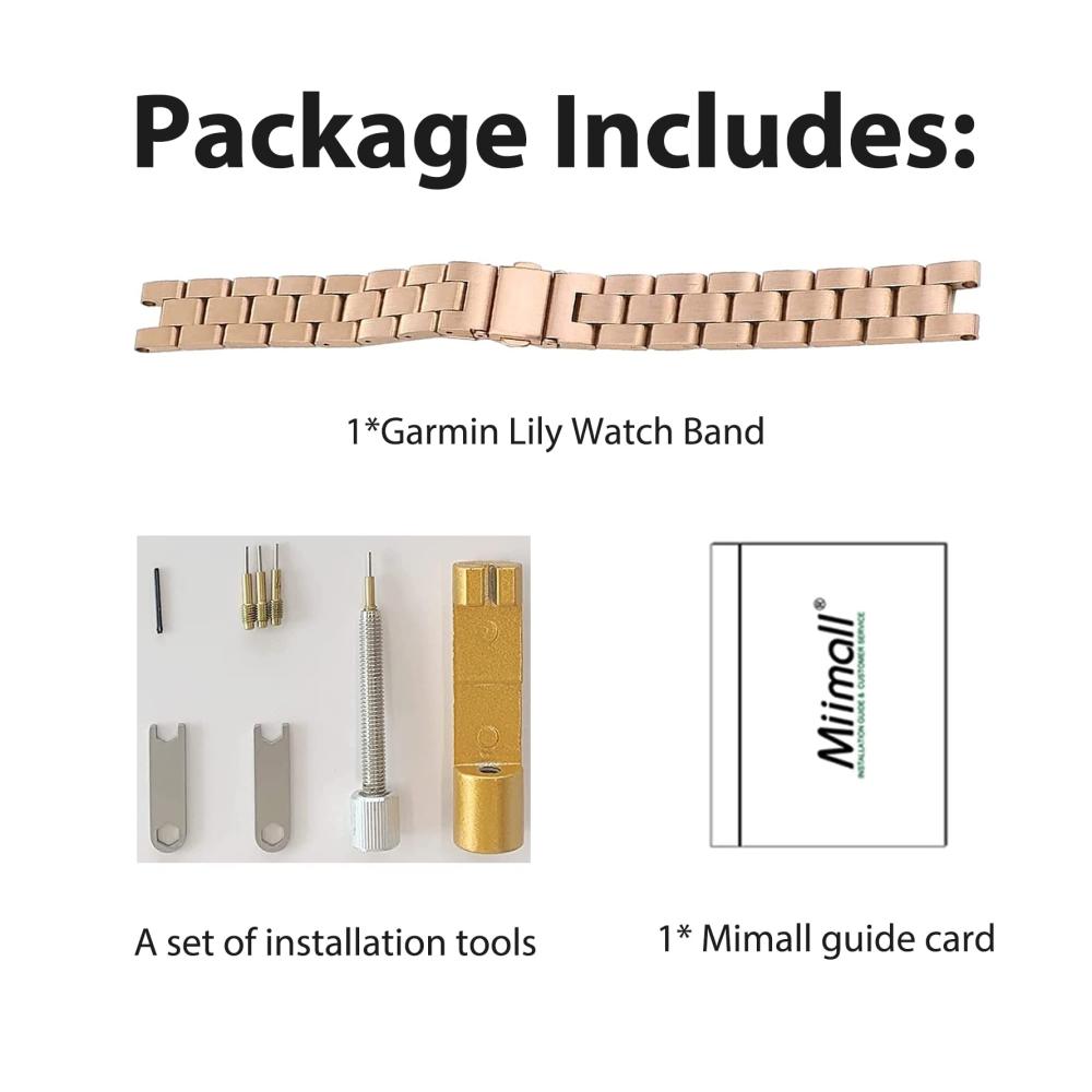[Miimall Service] Das Paket beinhaltet: 1 x Edelstahl Metall Ersatzarmband für Garmin Lily Smartwatch, 1 x Längen Einstellwerkzeug, 1 x After Sales Karte. Wenn Sie weitere Fragen haben, können Sie sich gerne an uns wenden. Wir werden Ihnen innerhalb von 24 Stunden antworten.