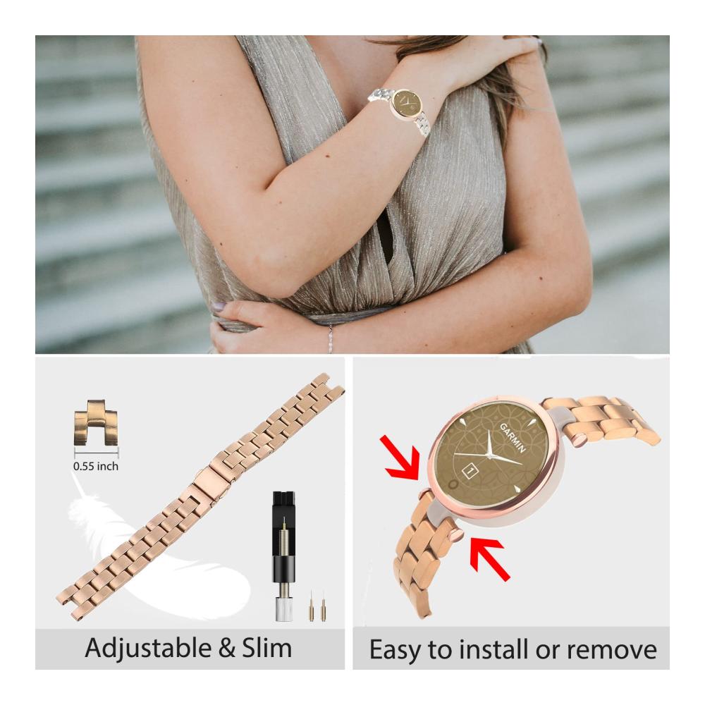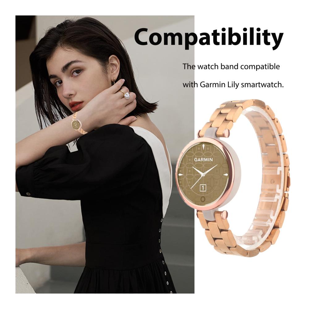 [Hochwertige Edelstahl Material] Dieses Garmin Lily Armband verwendet hochwertiges Edelstahlmaterial, sorgt für gute Qualität, glatte Berührung, ist langlebig, wasserdicht und schweißresistent. Super handwerkliche und plattierte Farbtechnologie sorgen für einen eleganten und klassischen Look, die Farbe ist nicht leicht zu verblassen.