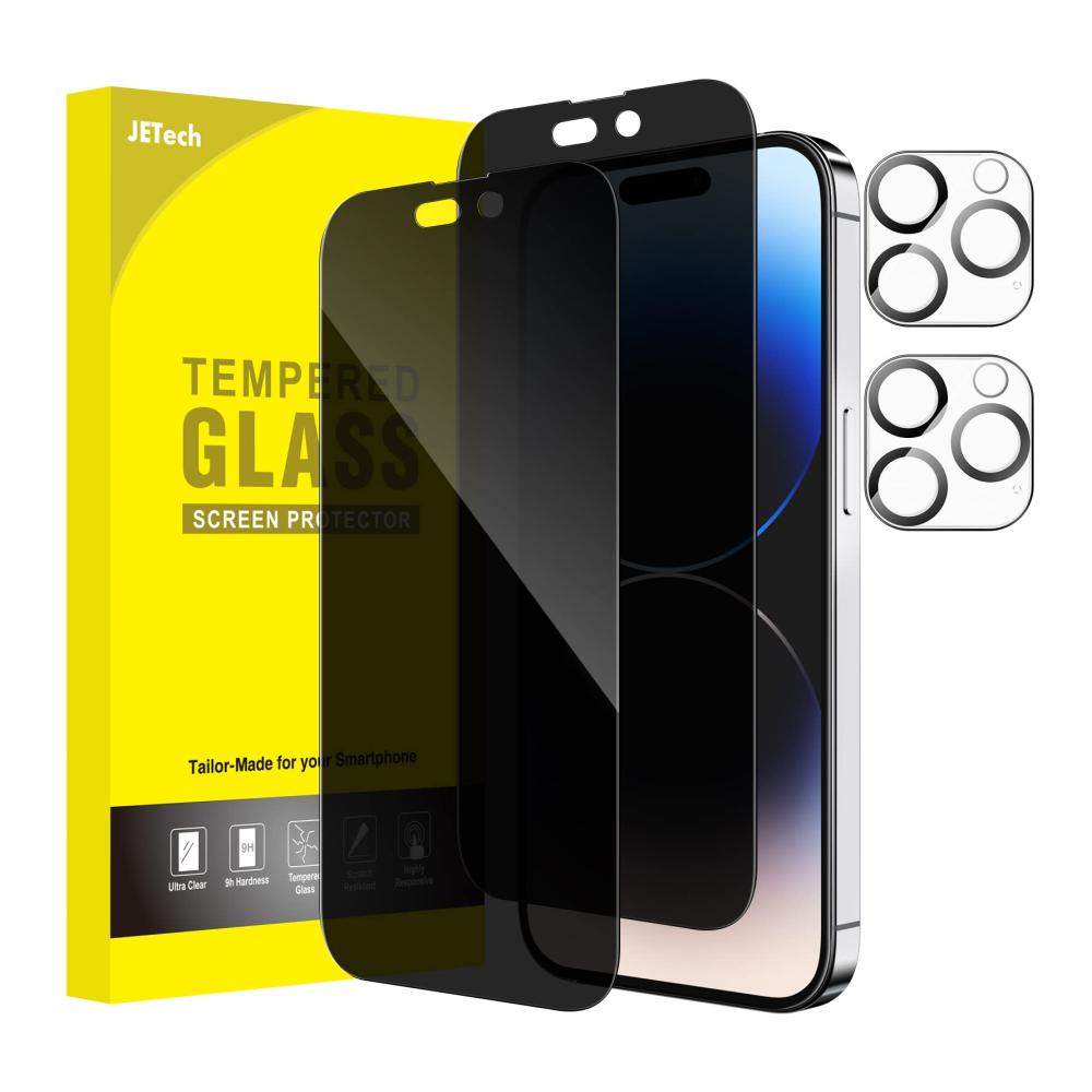 Kompatibel mit dem iPhone 14 Pro 6,1 Zoll und ausgestattet mit speziellen Merkmalen wie volle Abdeckung, Anti-Spähen, Kamera- und Bildschirmschutz – erleben Sie herausragende Qualität mit dem 2er-Pack JETech Schutzfolien.