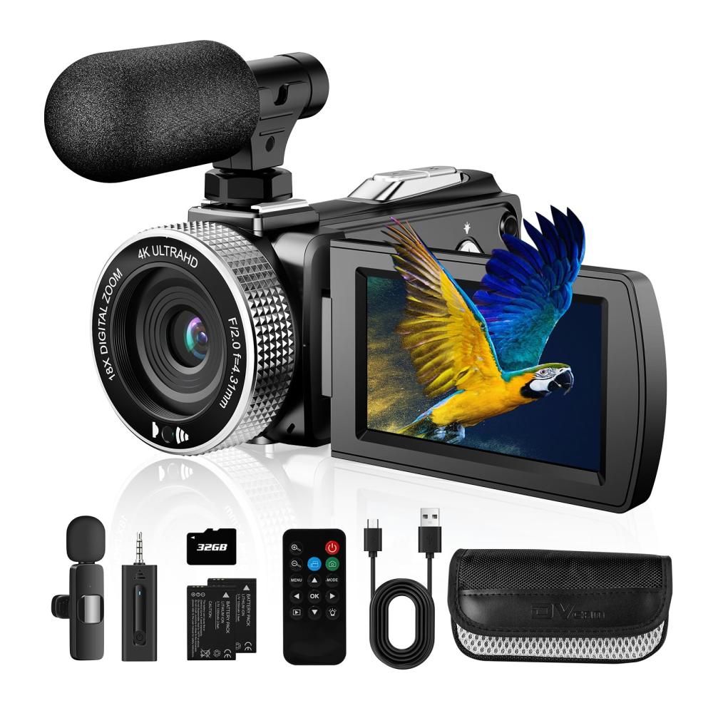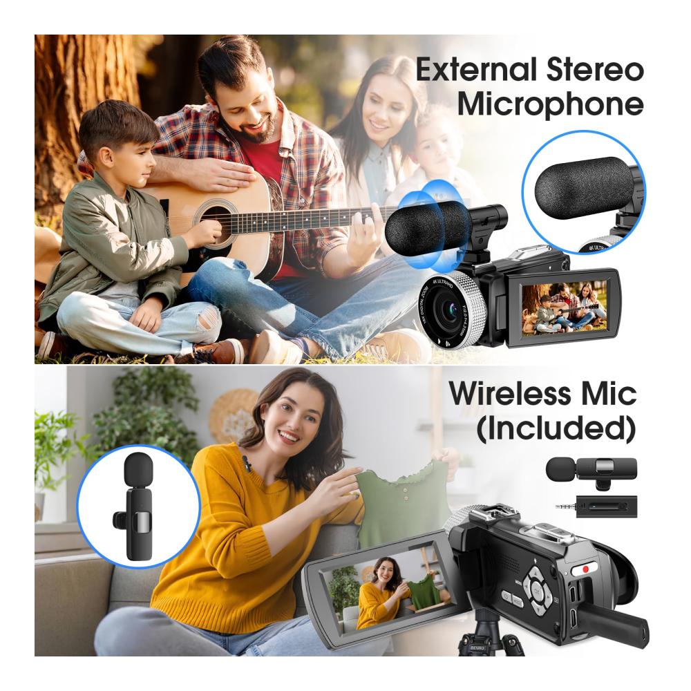 • Erleben Sie kinoreife Momente mit unserer hochmodernen 4K Videokamera. Erfassen Sie gestochen scharfe Fotos mit 48MP und flüssige 4K-Videos mit 60FPS. Dieser digitale Camcorder ist perfekt für Vlogging auf YouTube geeignet und wird mit 2 Batterien, einem kabellosen Mikrofon, einer SD-Karte und einer Fernbedienung geliefert. Tauchen Sie ein in die Welt der hochauflösenden Aufnahmen und teilen Sie Ihre Abenteuer mit Leichtigkeit.