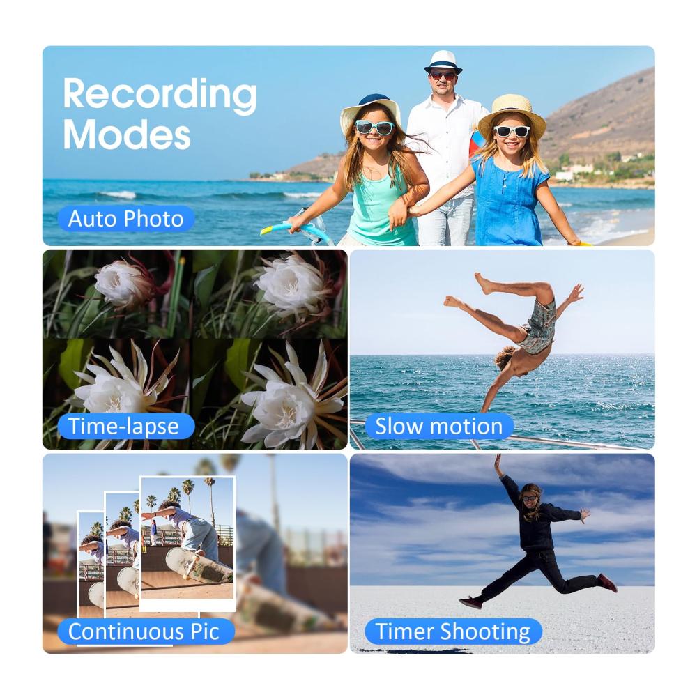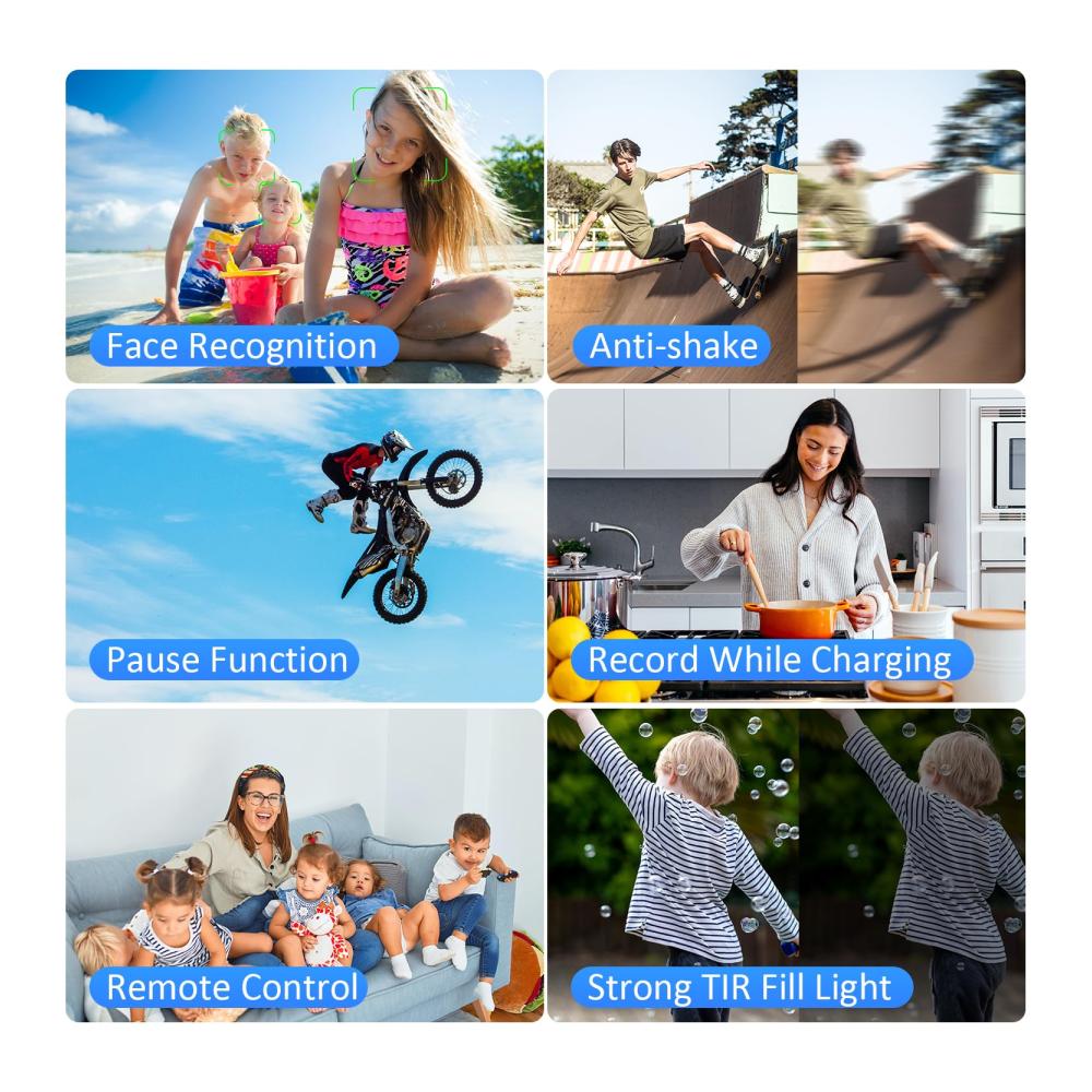 • 【Leistungsstarke Videokamera mit verschiedenen 】 Es verfügt über mehrere Videoaufnahmemodi, wie langsames Video für Zeitlupenaufnahmen, Zeitrafferaufnahmen und den Loop-Videomodus. Außerdem verfügt es über Serienbild, automatische Fotoaufnahme und Timeraufnahme. Wählen Sie einfach aus, was Sie brauchen. Darüber hinaus verfügt dieser Camcorder über zahlreiche nützliche Funktionen wie Gesichtserkennung, Anti-Shake-Funktion, Pausenfunktion, Aufnahme während des Ladevorgangs,