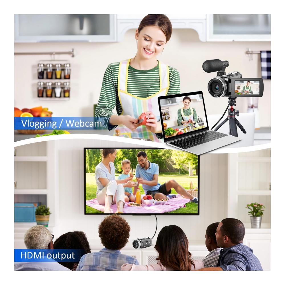 • 【Multifunktionaler Videokamera-Camcorder】 Der 4K-Camcorder kann als Vlogging-Kamera für YouTube oder Live-Streaming verwendet werden. Und Sie können es als PC-Webcam verwenden, nachdem Sie es an den Computer angeschlossen haben. Wenn Sie Ihre Videoclips außerdem auf dem Großbildfernseher teilen möchten, können Sie ihn über ein HDMI-Kabel (nicht im Lieferumfang enthalten) an Ihren Fernseher anschließen. Viel Spaß mit deinen Freunden und deiner Familie.
