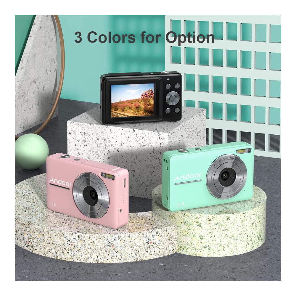 Andoer Digitalkamera. Spezifikationen: wiederaufladbare Digitalkamera. Farbe: Schwarz/Silber/Rosa/Violett/Mintgrün (optional). Zoomkamera. Bildsensor: CMOS-Sensor-Kamera, Digitalanzeige: 6,3 cm IPS-Digitalkamera. Dateiformat: JPEG/AVI-Digitalkamera. Wiederaufladbare Bildauflösung: 44 MP, 42 MP, 36 MP, 24 MP, 20 MP, 16 MP, 12 MP, 10 MP, 8 MP, 5 MP. Retro-Kamera Videoauflösung 1920 x 1080, 1280 x 720, 640 x 480 Vlogging-Kamera. Szene: Auto/Landschaft/Portrait/Nachtlandschaft/Nachtporträt/Strand/Sport/Abendessen, Akku-Digitalkamera, Weißabgleich: Auto/Tageslicht/Bewölkt/Fluoreszierend/Wolfram-Kamera. Selbstauslöser: Aus/2 Sek. / 5 Sek. / 10. sec Kameras Fotografie Zoomen Om: 16-facher Digitalzoom rosa Digitalkamera Belichtung: EV-3—EV 3 Kamera Teenager Stromversorgung: Lithium-Akku (3,7 V 700 mAh) Digital-Filmkamera Größe: 9,5 x 5,7 x 1,9 cm Kamera Digital Compact Gewicht: 113 g (einschließlich Akku) Lieferumfang: 1 x Digitalkamera. Kamera 2 x Batterien. 1 x USB-Ladekabel, 1 x Handschlaufe, 1 x Tragetasche, 1 x Reinigungstuch, 1 x Speicherkarte, 1 x Bedienungsanleitung (Englisch)