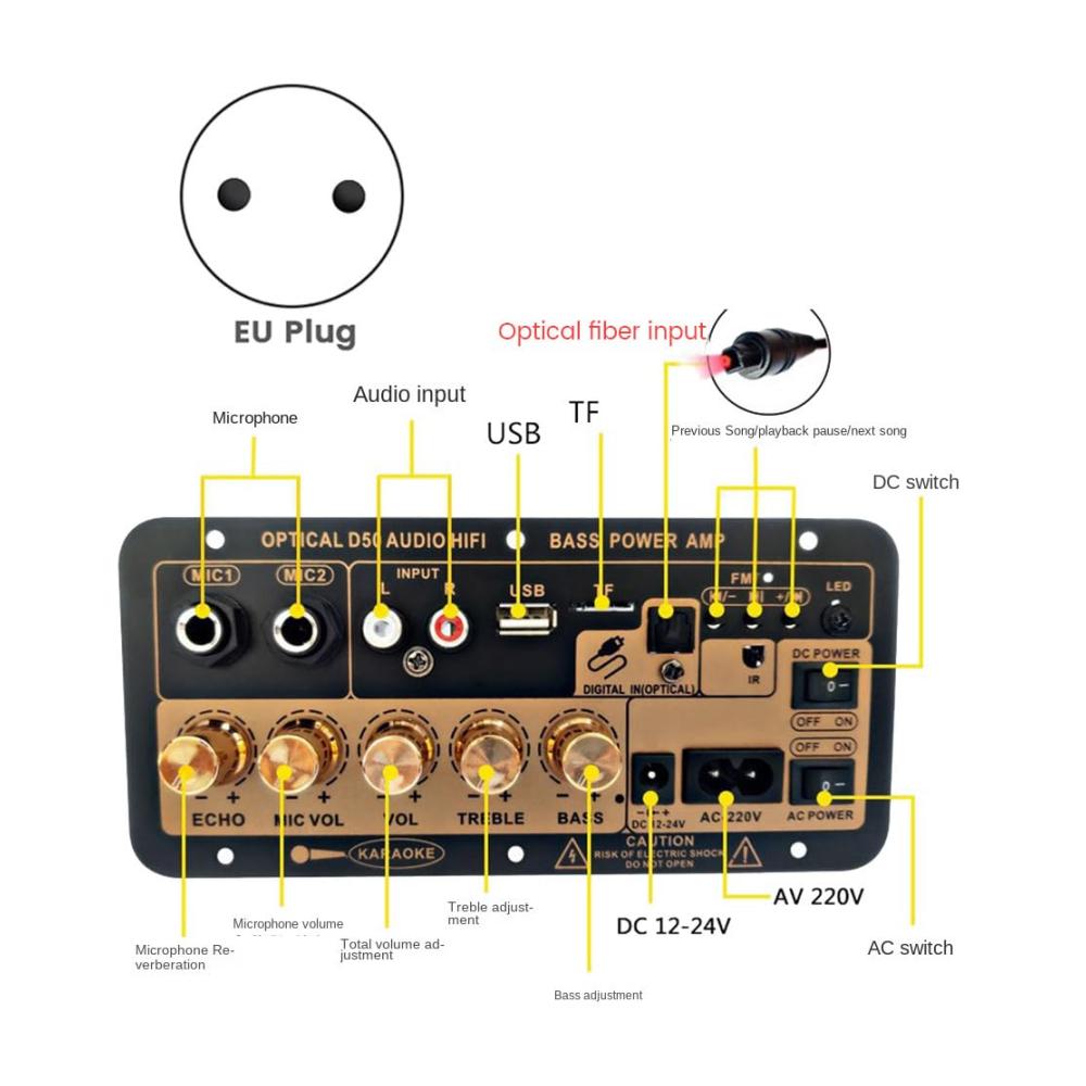 Erleben Sie mit unserem Hifi-Verstärker Set herausragenden Klanggenuss. Der D50 Kartenverstärker bietet eine Leistung von 100 W bis 300 W und ist ideal für Lautsprecher mit 4-8 Ohm. Ausgestattet mit einem EU-Stecker für den Einsatz in verschiedenen Ländern, darunter Indonesien, Deutschland, Frankreich, Spanien und Italien. Die Lieferung umfasst den Verstärker, ein Stromkabel, ein Audiokabel und eine Fernbedienung. Genießen Sie die Vielseitigkeit dieses Produkts für Zuhause und Auto.