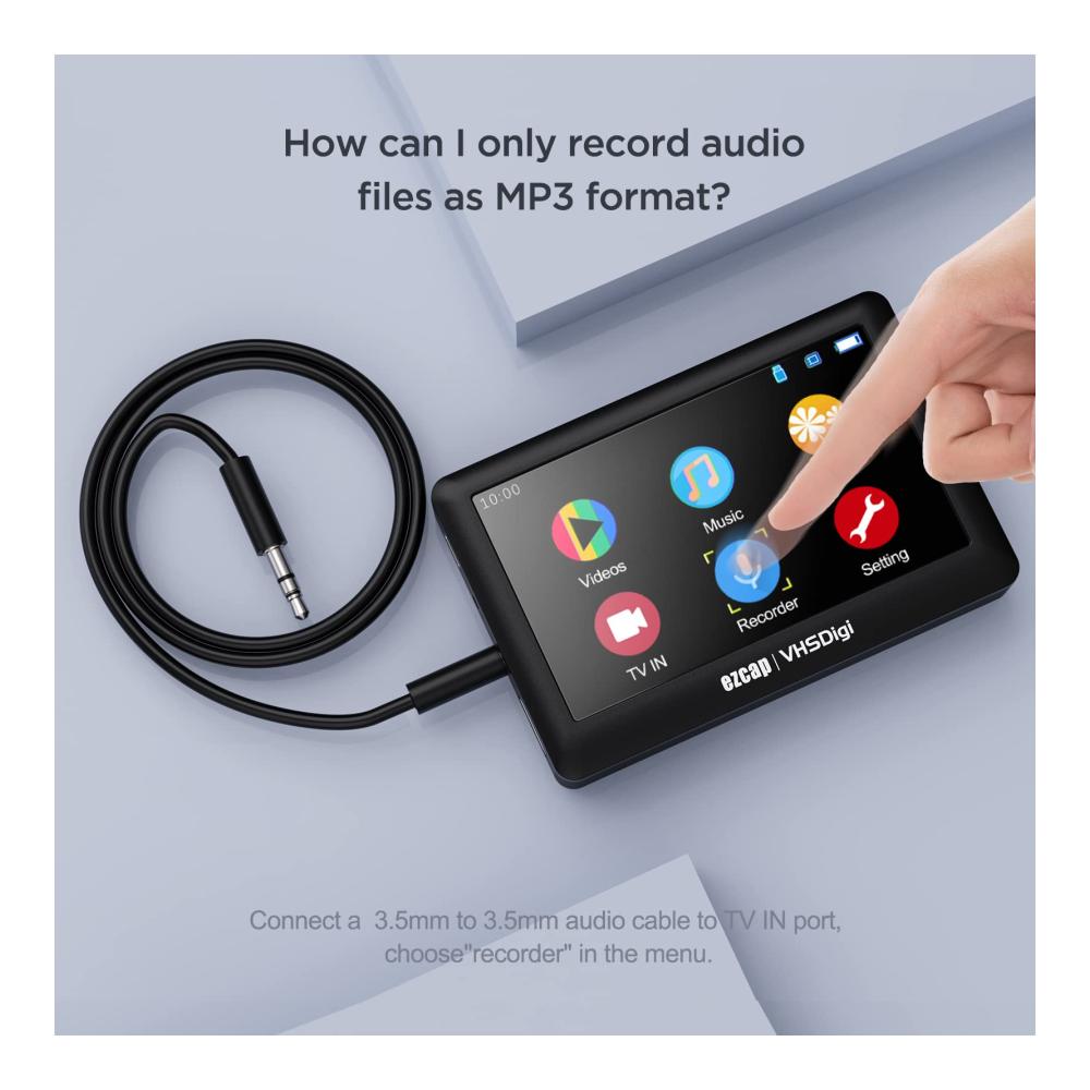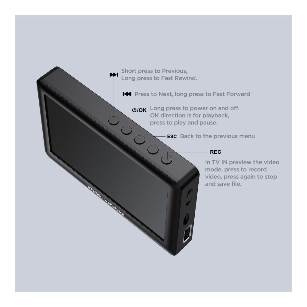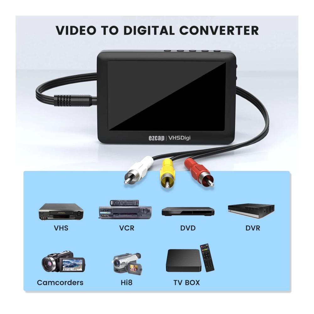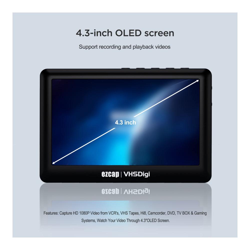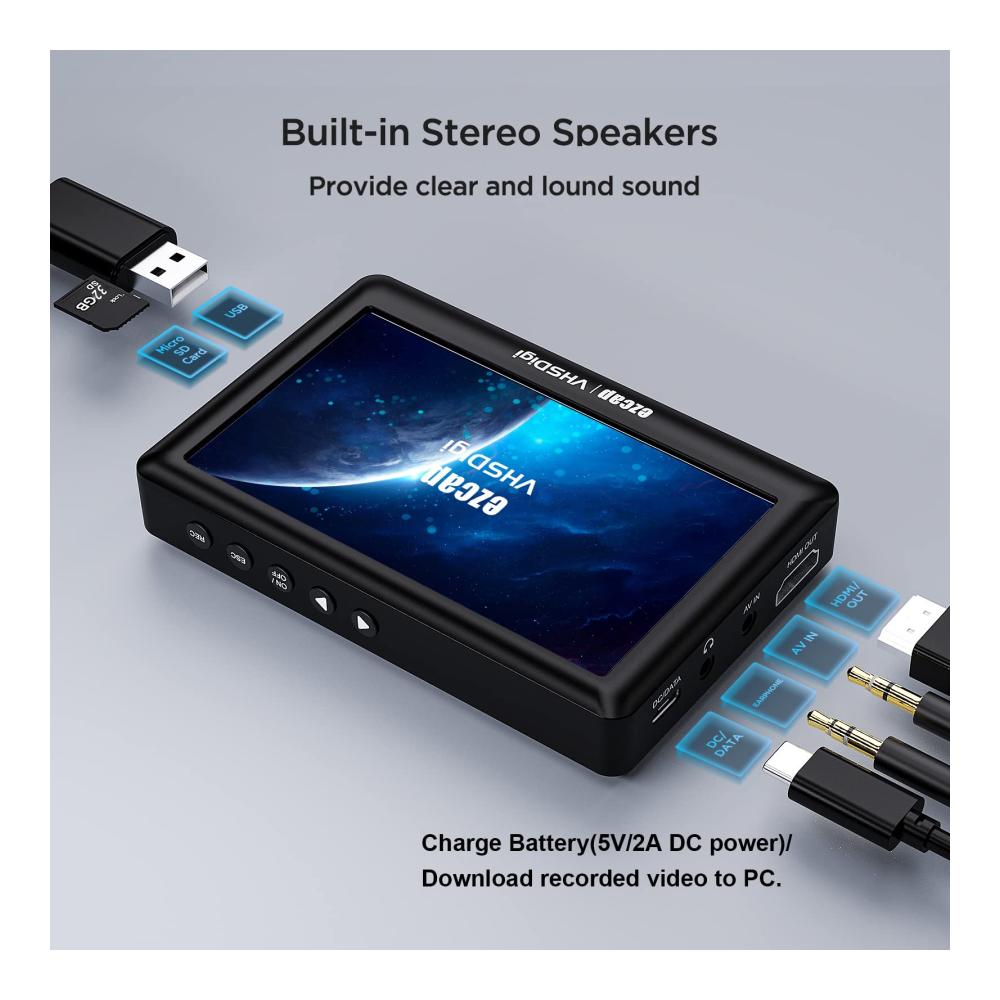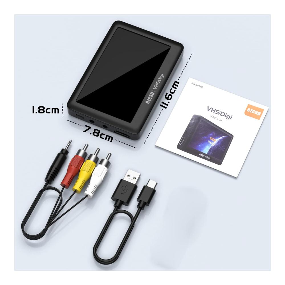 FEATURES: Nehmen Sie Videos von Ihrem VHS,Hi8,Camcorder,DVR und Spielesystem mit einem Klick auf und digitalisieren Sie sie,ohne dass ein PC erforderlich ist. Kein Computer oder Software erforderlich,übertragen Sie die Filme direkt auf eine SD-Karte/USB-Stick.Unterstützt FAT32 und exFAT,unterstützt nicht das NTFS-Format,maximal 32GB. Konvertieren Sie analoge Musik in digitales Format allein. Mit 4,3-Zoll-Kristall-Display. Lautsprecher und Batterie im Inneren. Spielen Sie Videos, Musik und Bilder direkt ab. Tragbare Mini-Größe Schritte für die Aufnahme: 1:Schließen Sie Ihren Video Grabber mit dem mitgelieferten RCA-Kabel an die Videoquelle an:VHS,Videorekorder,AV,RCA,Hi8,Camcorder,DVD-Player) 2:Nachdem Sie das Gerät eingeschaltet haben. Drücken Sie die „REC“-Taste am Konverter,um aufzunehmen.Sie können es auch direkt auf dem Bildschirm nach der Aufnahme mit der Wiedergabetaste ansehen. 3:Übertragen Sie Ihre digitalisierten Videos auf Ihren Computer mit dem mitgelieferten Typ-C-Kabel.Dann legen Sie sie auf Ihrem PC,Telefon. Spezifikation: Schnittstelle:USB 2.0 Videoeingang: Composite-Video über 3,5mm auf 3RCA AV-Kabel Audioeingang: Analoges L/R-Audio über 3,5mm auf 3RCA-AV-Kabel oder 3,5-Audiokabel Video-Ausgang: HDMI 480P60 Audioausgang: HDMI,3,5mm-Kopfhöreranschluss, Lautsprecher innen Benutzeroberfläche:Tasten:OK/POWER,LINKS,RECHTS,ESC,REC,LAUTSTÄRKE.4,3 Zoll TFT-Bildschirm,Lautsprecher im Inneren,1500mAh Lithium-Batterie im Inneren. Speichermedien:Micro-SD-Karte und USB-Flash-Laufwerk,unterstützt FAT32 und exFAT,unterstützt nicht das NTFS-Format,maximal 32GB. Aufnahmequalität:480@30fps,NTSC:720×480,PAL:720×576 Aufnahmeformat:Video:mp4,Audio:mp3 Aufnahmedatei:Video:etwa 4,2MB/Minute,250MB/Stunde.Audio:1,2MB/Minute Wiedergabeformat:Video:avi,mov,mkv,webm,mp4,m4v,flv,3gp,3g2,3gpp,dat,vob,evo,mpg,asf,trp,ts,m2ts,mts. Audio:mp3,ogg,ape,flac,wav,amr,aiff
