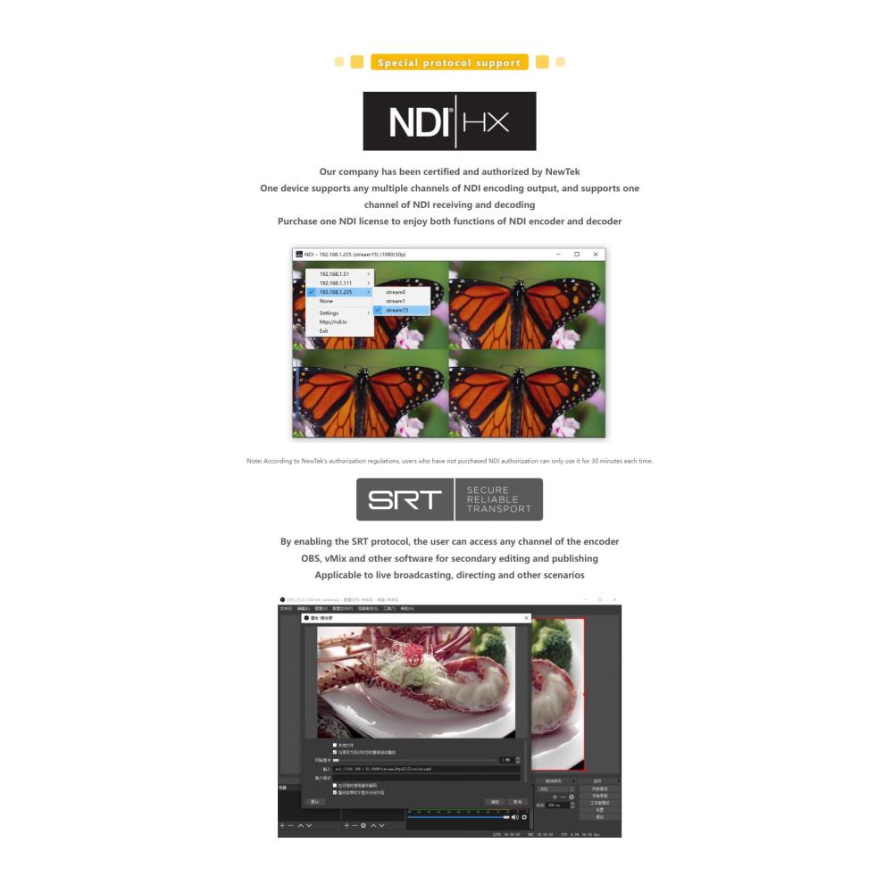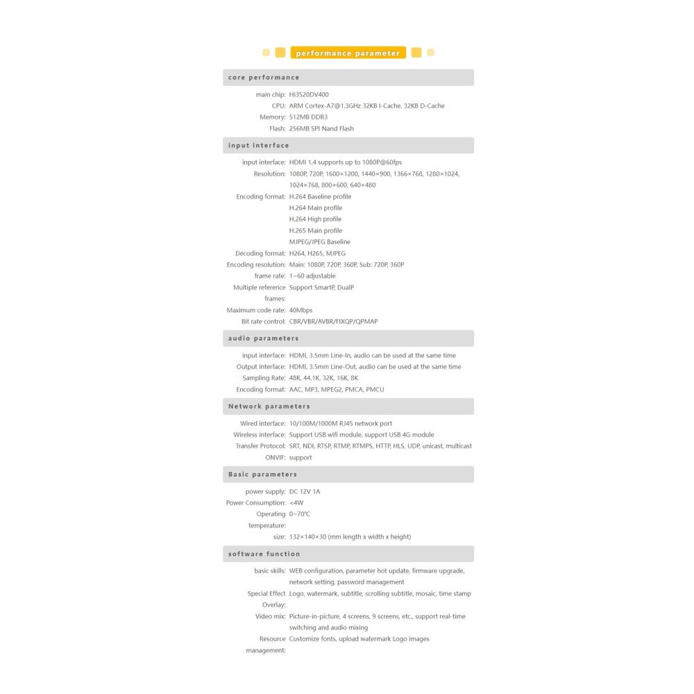 Unterstützt H.264-Codierung SmartP: HDMI 1.4 unterstützt bis zu 1080p @ 60fps-Eingabe und Multiprotokoll-Live-Übertragung, einschließlich RTSP / RTMP / HTTP / HLS / UDP / Unitcast / Multicasting
