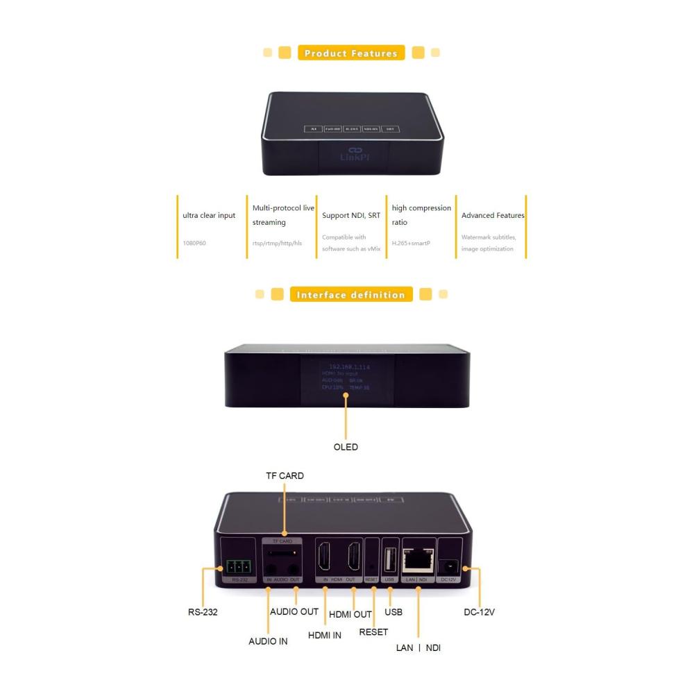 Entdecken Sie den LinkPi ENC1-V2 H.264 HDMI Video HD-Encoder mit einer Auflösung von 1080P bei 60 Hz für Live-Übertragungen! Dieser Encoder unterstützt eine Vielzahl von Protokollen wie SRT, RTSP, RTMP, HTTP und HLS und bietet zudem RS232-Unterstützung. Mit einer Mini HDMI-Schnittstelle und einem Gewicht von 400 Gramm ist dieser Encoder leicht zu handhaben. Betrieben mit einer Eingangsspannung von 12 Volt bietet er eine zuverlässige Leistung. Der ENC1-V2 unterstützt auch WiFi/4G-Module und eine breite Palette von Plattformen für ein nahtloses Streaming-Erlebnis.