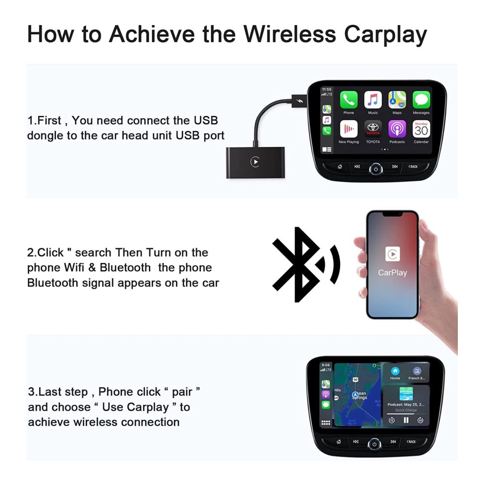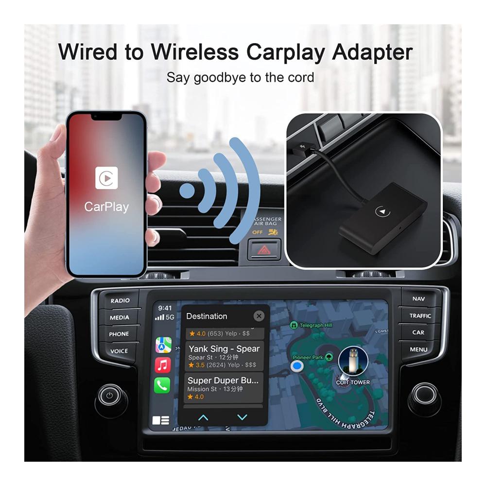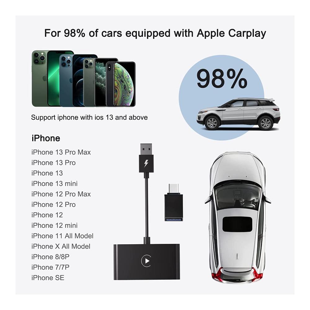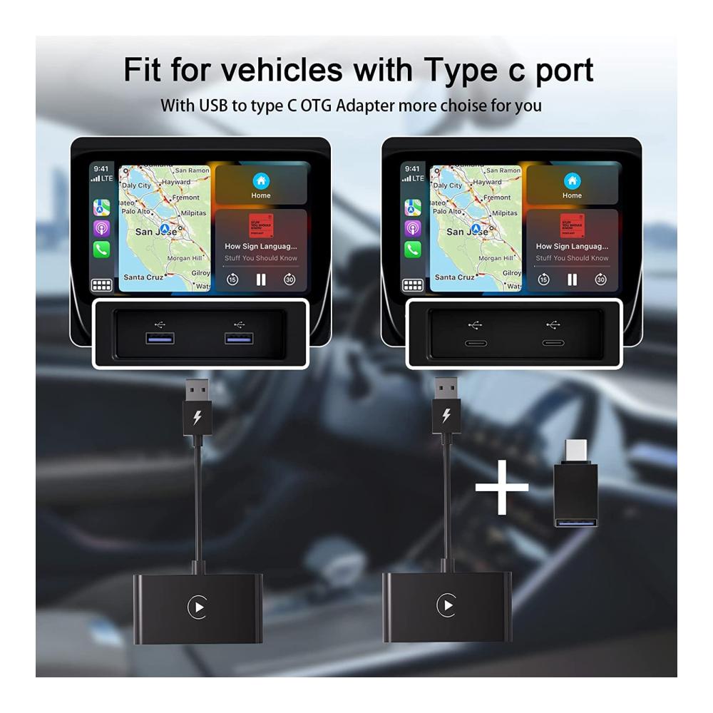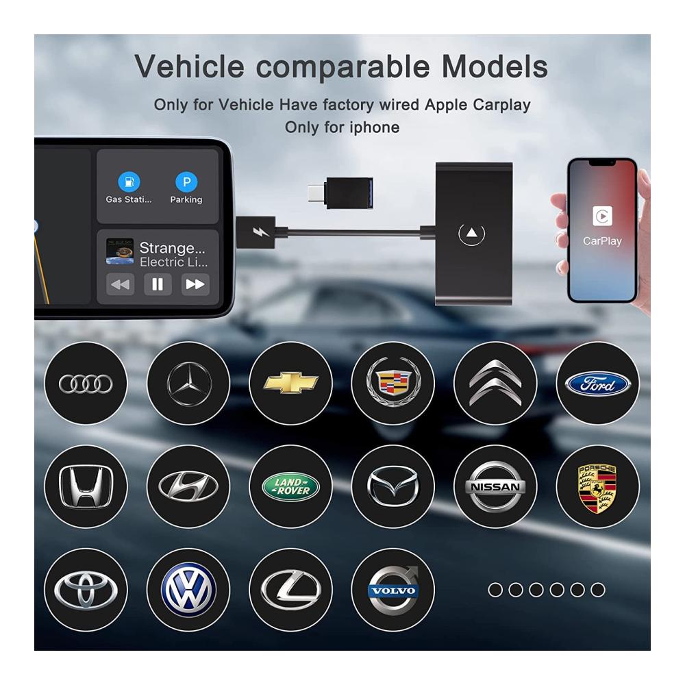 Breite Kompatibilität: Unser drahtloses Apple Carplay wird mit einem USB-zu-Typ-C-OTG-Adapter geliefert, um Ihnen mehr Auswahl zu bieten, und ist mit 98 % der werkseitigen drahtlosen CarPlay-Autoadapter kompatibel. (HINWEIS: Bitte stellen Sie sicher, dass Ihr Auto Apple Carplay unterstützt.) Drahtlose Carplay-Adapter sind mit 2015er Hendai-Automodellen und iPhone 6 mit iOS 10 oder höher kompatibel.
