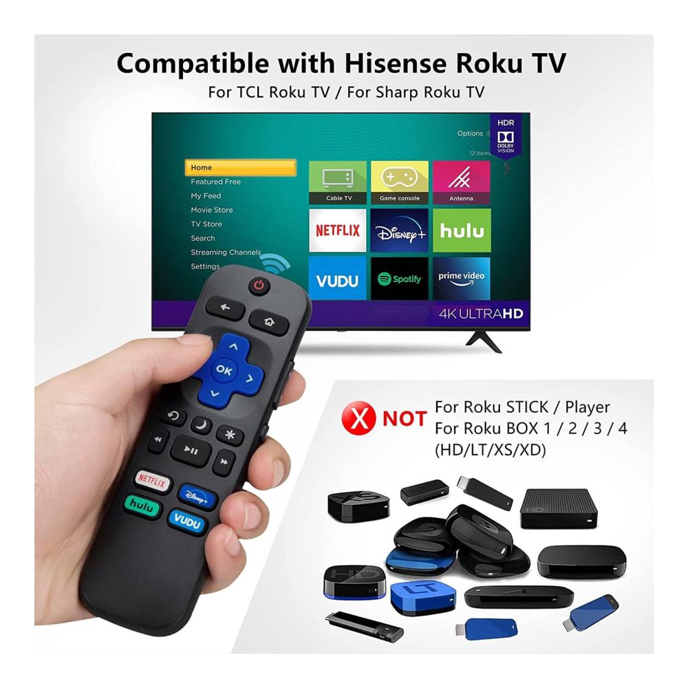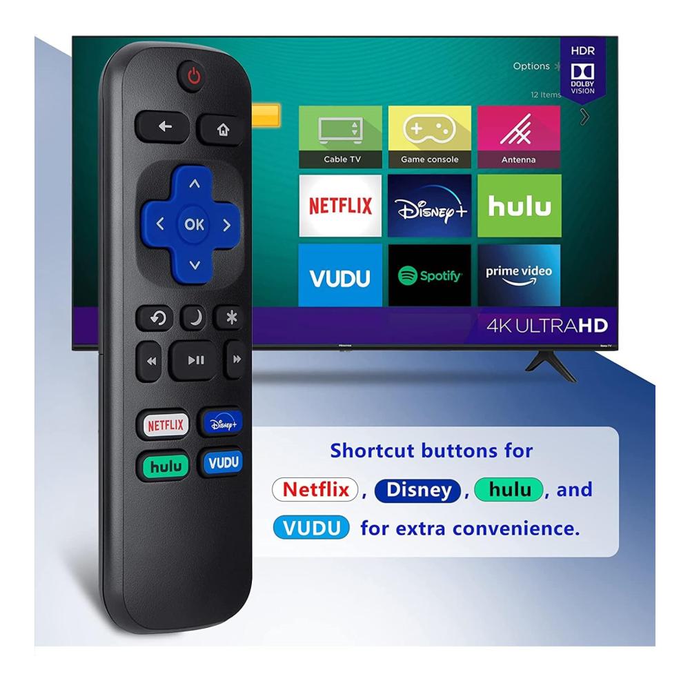 Ersetzen Sie Ihre alte oder kaputte Fernbedienung für Ihren Smart-TV durch unsere kompatible Ersatzfernbedienung. Unsere Fernbedienung ist perfekt für Hisense, TCL, Sharp, RCA, JVC, Westinghouse, Sanyo und Element Smart-TVs geeignet. Mit Lautstärke- und Stummschaltungstasten an der Seite haben Sie die volle Kontrolle über Ihren Fernseher. Darüber hinaus verfügt es über Shortcut-Tasten für Netflix, Disney, Hulu und VUDU für zusätzlichen Komfort. Hinweis: Batterien sind nicht im Lieferumfang enthalten und werden zwei 1,5 V AAA-Batterien benötigt.