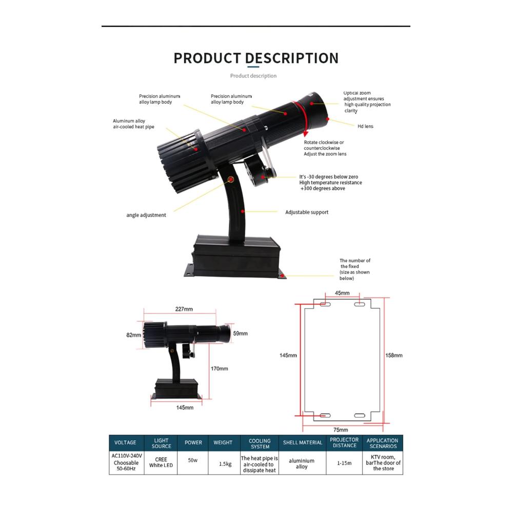 [Super Bright]: Mit 50 -W -LED ausgestattet, bietet dieser Logo -Projektor helle Balken, um die Indoor-/Outdoor -Anwendungen Ihrer Marke zu fördern. Es ist eine ideale Wahl für kleine Werbung, Unternehmensaktivitäten, Einzelhandelsgeschäfte und Hochzeiten.
