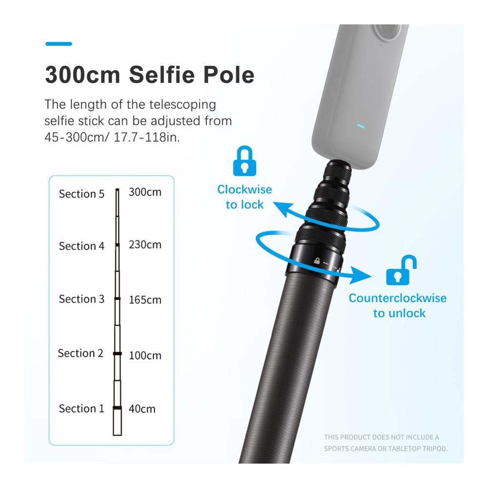 Entdecken Sie das ultimative Zubehör für Ihre X2/X3: Unser tragbarer Selfie-Stick ist mehr als nur ein Ständer – er ist ein vielseitiges Stative aus Kohlefaser mit 4 Abschnitten und 1/4-Zoll-Schraube. Mit einer beeindruckenden Länge von 3 Metern/118 Zoll bietet er Ihnen die Freiheit, perfekte Selfies und Videos aus jedem Winkel aufzunehmen. Leicht und kompakt, ideal für unterwegs. Holen Sie sich jetzt Ihr eigenes Stück Innovation!