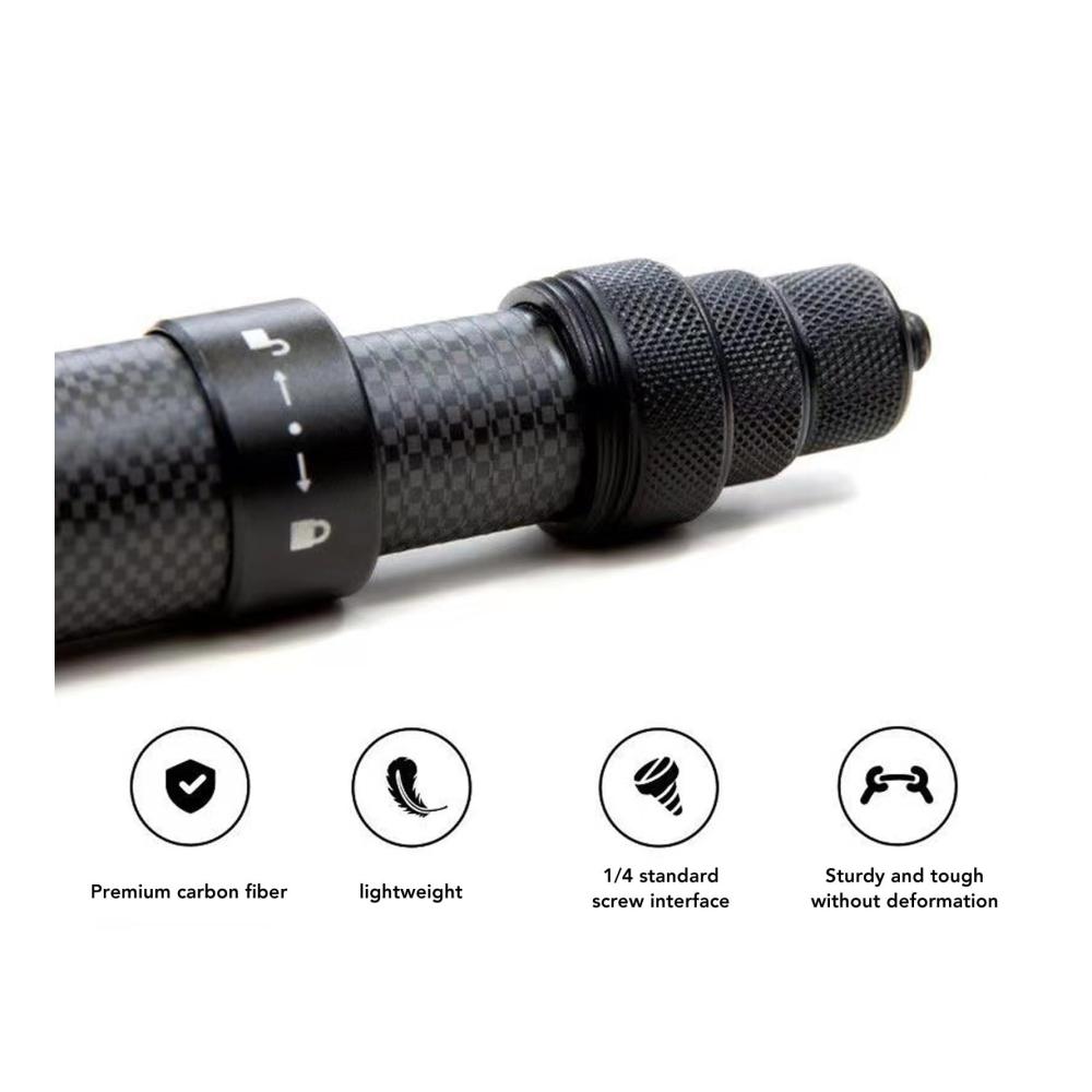 • Kohlefasermaterial: Dieser Selfie-Stick besteht aus hochwertigem Kohlefasermaterial und ist unglaublich stark sowie biege- und bruchsicher. Es kann problemlos schwere Action-Kameras tragen und Korrosions- und Stoßkräften standhalten, sodass es für den Einsatz in verschiedenen Umgebungen, einschließlich Unterwasser, geeignet ist.