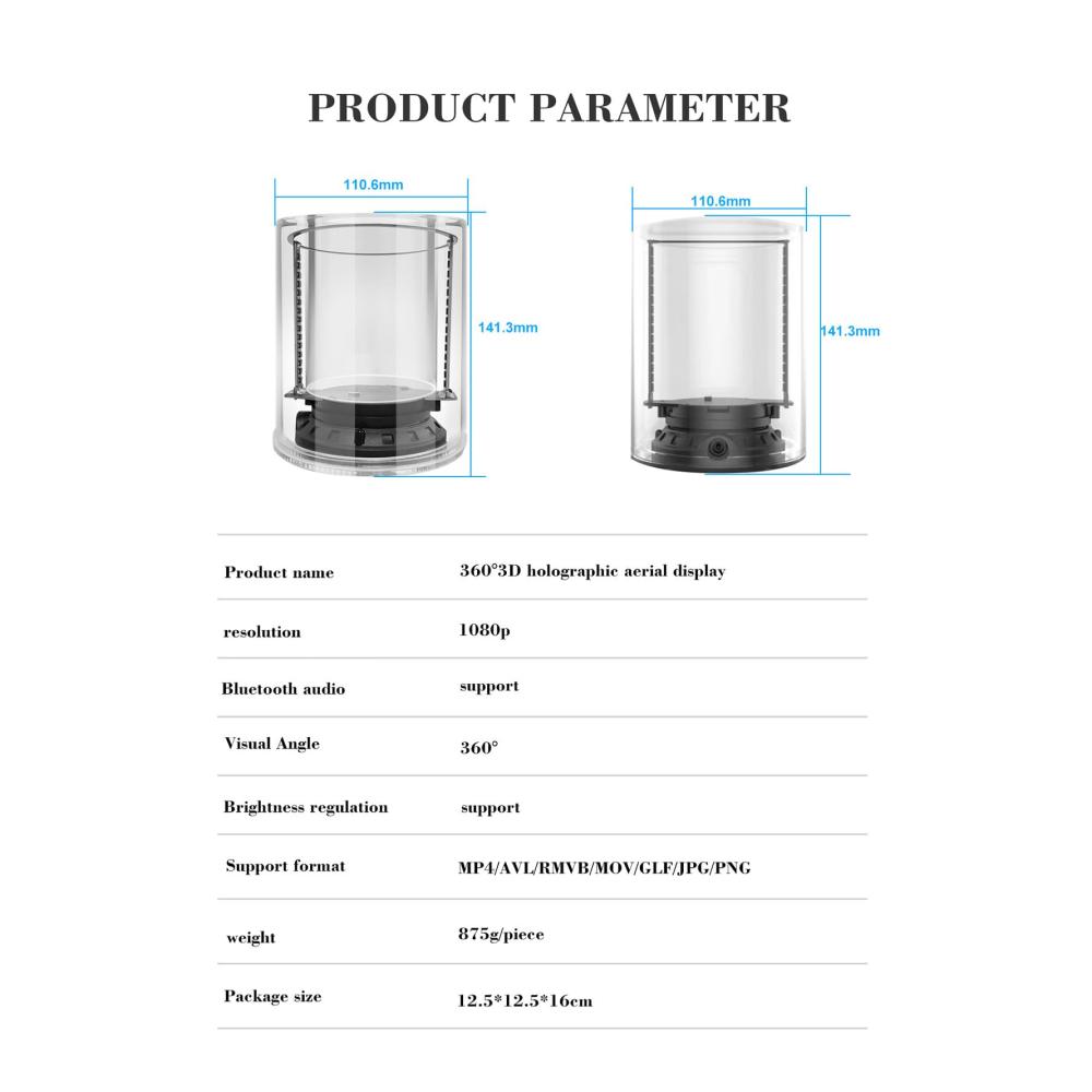 Merkmale:1. Dieser zylindrische 5D-Lüfter mit 360°-Betrachtungswinkel kann das Material nach Belieben wechseln und kann per mobiler App/Computer bedient werden.2. Unterstützt die Bluetooth-Audiofunktion, kann zur Musikwiedergabe an Bluetooth-Lautsprecher angeschlossen werden und bietet so ein doppeltes visuelles und akustisches Erlebnis.3. Acryl verleiht Ihrem Display ein schlichtes, modernes Aussehen und kann Ihre Exponate elegant präsentieren.4. Durch die Verwendung hervorragender Motoren flackert der Bildschirm nicht. Durch die Verwendung hochdichter LED-Rotationsbilder verfügt das Anzeigegerät über visuelle 5D-Effekte.5. Zwei Stile zur Auswahl; Geeignet für KTV, Restaurants, Veranstaltungsorte, Konferenzzentren, Privathäuser usw., um Ihren Produkten oder Aktivitäten den größtmöglichen Reiz zu verleihen.Spezifikation:Produkttyp: holografischer 3D-FächerMaterial: PC, HardwareAuflösung: 1080PSteckerspannung: 220–240 VBluetooth-Audio: UnterstützungBetrachtungswinkel: 360°Helligkeitsanpassung: UnterstützungUnterstützte Formate: MPA/AVL/RMVB/MOV/GLF/JPG/PNGGewicht: 875gVerpackungsgröße: 12,5 * 12,5 * 16 cmPackliste:1 x holografischer 3D-Lüfter1 * Adapter1 * FernbedienungAnmerkungen:Da die Messungen von Hand durchgeführt werden, können die angezeigten Maße geringfügig variieren. Danke für Ihr Verständnis.Die tatsächlichen Farben können aufgrund unterschiedlicher Monitore und Lichteffekte geringfügig von den Bildern abweichen.