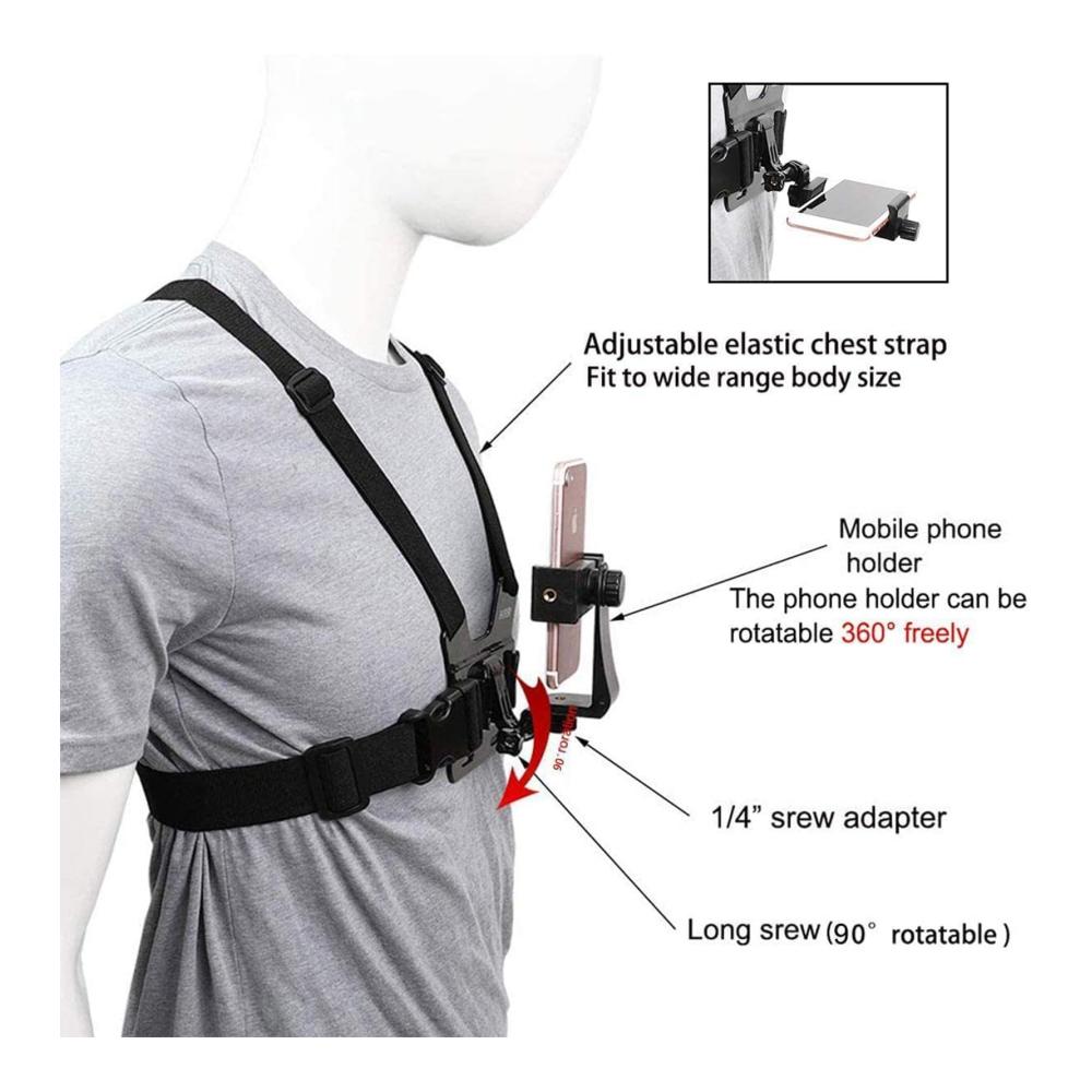 Entdecken Sie die Vielseitigkeit unseres Telefon-Brustgurthalters mit Handy-Smartphone-Clip! Verstellbare Träger passen sich an verschiedene Körpertypen an und ermöglichen freihändiges Aufnehmen von Videos und Fotos.