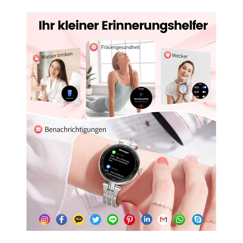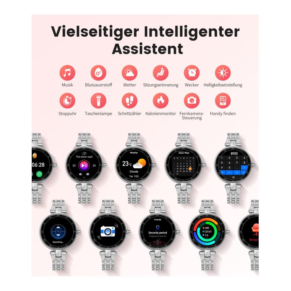 💎 Elegantes Design mit Diamanten und über 200 anpassbaren Zifferblättern: Eine elegante runde Smartwatch für Damen mit einem 1,16-Zoll-AMOLED-Bildschirm, verziert mit zarten Diamanten für einen Hauch von Luxus und Eleganz. Zusätzlich ist sie mit zwei hochwertigen Armbändern aus unterschiedlichen Materialien ausgestattet: einem robusten Metallarmband mit Diamanten und einem weichen Silikonarmband. Sie können zwischen über 200 anpassbaren Zifferblättern wählen oder Ihre Lieblingsbilder für ein individuelles Zifferblatt hochladen.