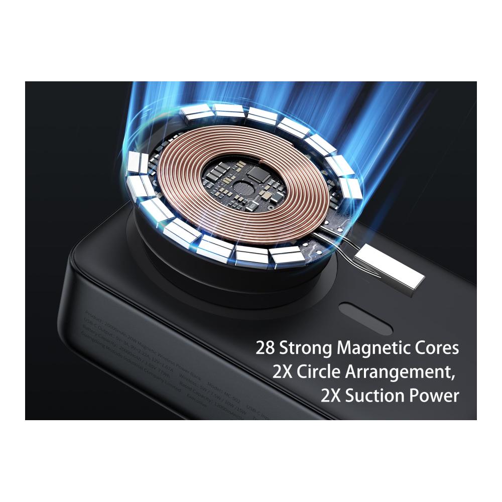 【Einzigartiges magnetisches Mechanismusdesign】: Unterstützt kabelloses Laden mit 15W und verwendet die neueste Magnettechnologie von Magsafe mit 28 leistungsstarken Magneten, die in doppelter Kreisanordnung mit doppelter Anziehungskraft angeordnet sind. Mit hochpräzisen Ausrichtungsmagneten und einem magnetischen Mechanismus wird durch Magnetkraft eine präzise Ausrichtung zwischen dem Powerbank und dem Gerät ermöglicht. Es kann 14N -Spannungen und 4440Gs -Induktion erreichen.