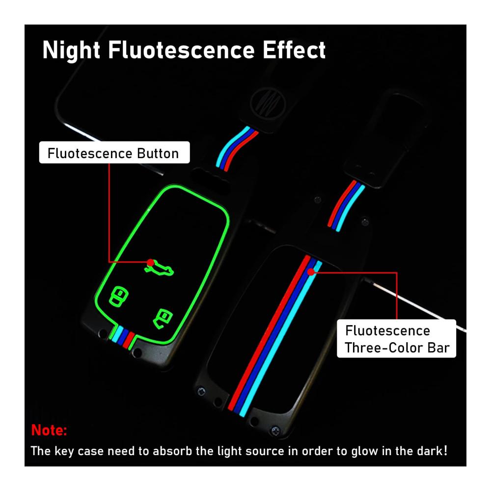 Wasserdicht und staubdichtUnsere Metall-Fernschlüsselhülle aus hochwertigem Zinklegierungsmaterial, stilvoll und langlebig, erfrischt Ihr Schlüsseletui und verleiht Ihnen ein anderes Luxusgefühl. Die Metallhülle und die Silikontastenabdeckung sind genial kombiniert. Machen Sie sich keine Sorgen, dass die Schlüssel nass werden . | Verhindern Sie Kratzer, Anti-FallDie neu verbesserte Schlüsselanhänger-Abdeckung bietet wirklich einen umfassenden 360 ° -Schutz. Sie hat eine gute Textur, ein stilvolles und elegantes Aussehen, ist verschleißfest, langlebig, oxidationsbeständig, lichtecht, stoßfest und tropfenfest. Vollständige 360-Grad-Abdeckung , Es schützt Ihre Schlüsselanhänger effektiv und eng vor Beschädigungen, Staub und Kratzern, selbst wenn Ihre Schlüssel herunterfallen, und schützt die Empfindlichkeit der Fahrzeugschlüssel besser. | NachtfluoreszenzeffektDie Tasten und die dreifarbige Leiste auf der Silikonabdeckung, die starke Lichtquellen absorbieren kann und nachts einen leuchtenden Effekt hat, lassen Sie die Tastenposition leicht erkennen. Hinweis: Die Knöpfe und der dreifarbige Balken auf der Silikonhülle müssen die Lichtquelle absorbieren, um im Dunkeln zu leuchten! |