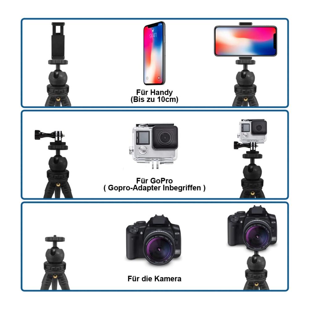 Kompatible Geräte : Einer für Handys und einer für eine Kamera. Das Stativ der Kamera ist voll kompatibel mit DSLR-Kameras und Sportkameras. Das Handystativ funktioniert gut mit allen Smartphones.