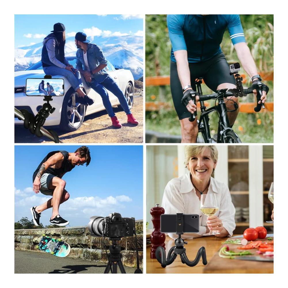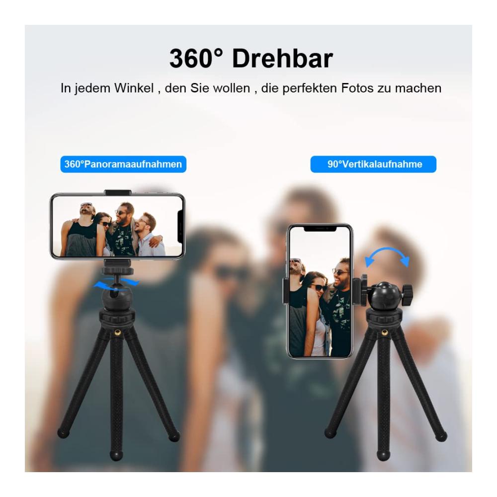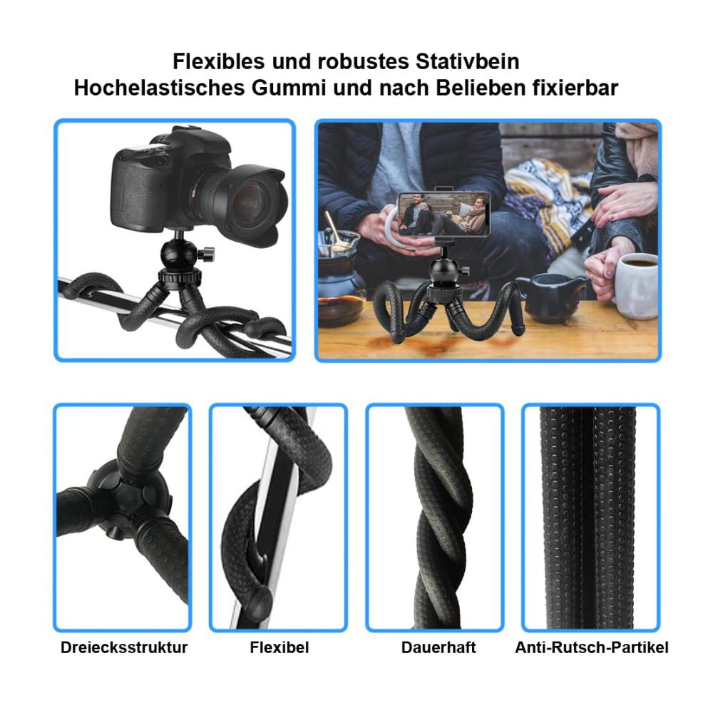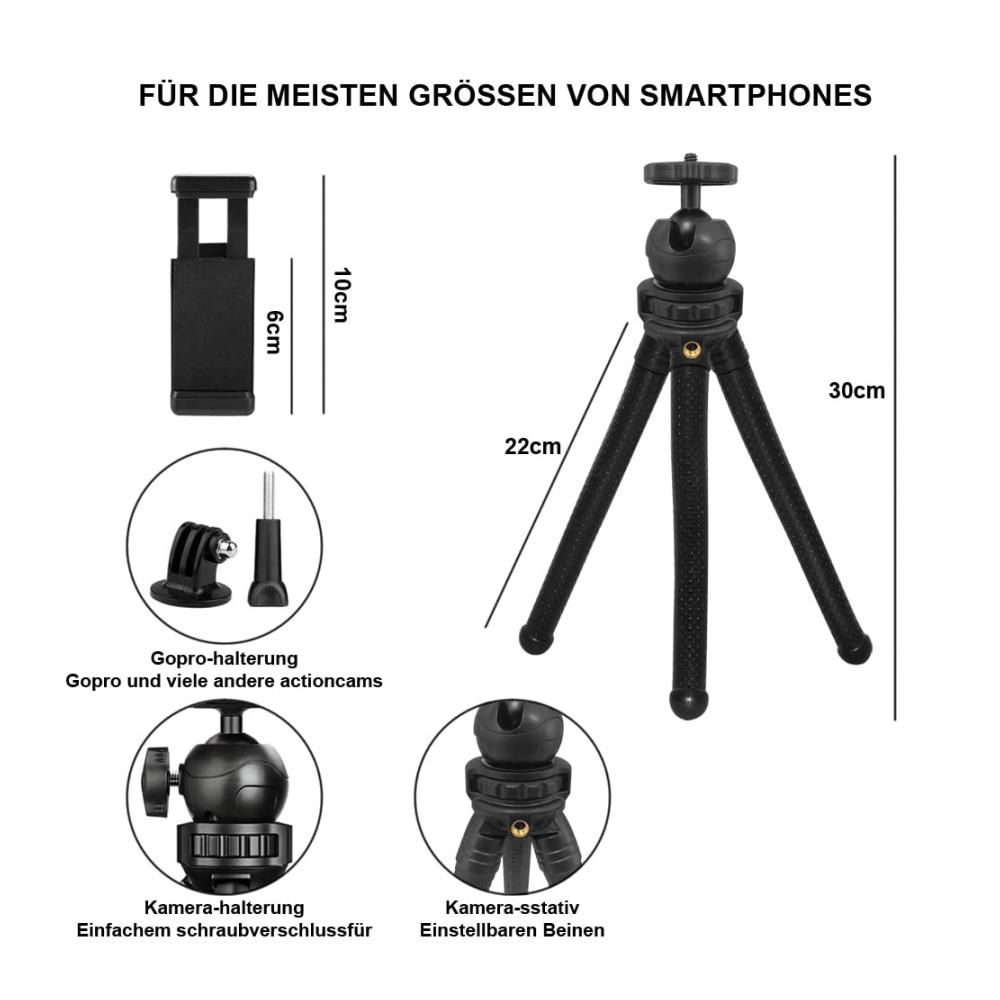 【HOHE STABILITÄT】 Mit dem Stativ kann Ihr Telefon auf einem flachen Schreibtisch oder einer unebenen Oberfläche montiert werden, was es zur besten Option für die Aufnahme wundervoller Momente macht. Die HOMSCAM-Beine können in jede Form gedreht und dadurch zB. um einen Baum, Fahrrad oder Stuhl gewickelt werden. 【360° DREHBARER KOPF】 Diese Stativhalterung für Telefone mit Kugelkopf bietet eine 360°-Aufnahmeperspektive, mit der Sie die perfekte Aufnahme machen können. Ebenso können Sie es auch um 90 Grad drehen. Sie können jeden gewünschten Winkel einstellen. 【TRAGBAR UND FLEXIBEL】 Dieses Stativ hat kleine Abmessungen, ideal für den Rucksack, wodurch es auf Reisen oder zu Fuß leicht transportierbar ist. Die flexiblen und formbaren Beine funktionieren gut auf einer unebenen oder flachen Oberfläche und ermöglichen es Ihnen, das Stativ fast überall dort anzubringen, worum Sie die Beine wickeln können. 【BREITERE KOMPATIBILITÄT】 Im Lieferumfang dieses Stativs sind zwei Befestigungsköpfe enthalten; einer für Handys und einer für eine Kamera. Das Stativ der Kamera ist voll kompatibel mit DSLR-Kameras und Sportkameras. Das Handystativ funktioniert gut mit allen Smartphones. 【SELFIE MODUS】 Mit der drahtlosen Fernbedienung können Sie Aufnahmen (Hoch- und Querformat) aus einer Entfernung von bis zu 5m machen. Perfekt für Selfies, Gruppenfotos, Filmen, Vlogging und Live-Streaming. Entdecken Sie das vielseitige Handy Stativ HOMSCAM 2023 – Ihr perfekter Begleiter für stabile Aufnahmen unterwegs! Mit seinem flexiblen Ministativ-Design passt es sich jedem Gelände an. Das Stativ ist nicht nur für Handys geeignet, sondern auch für Kameras und GoPros.